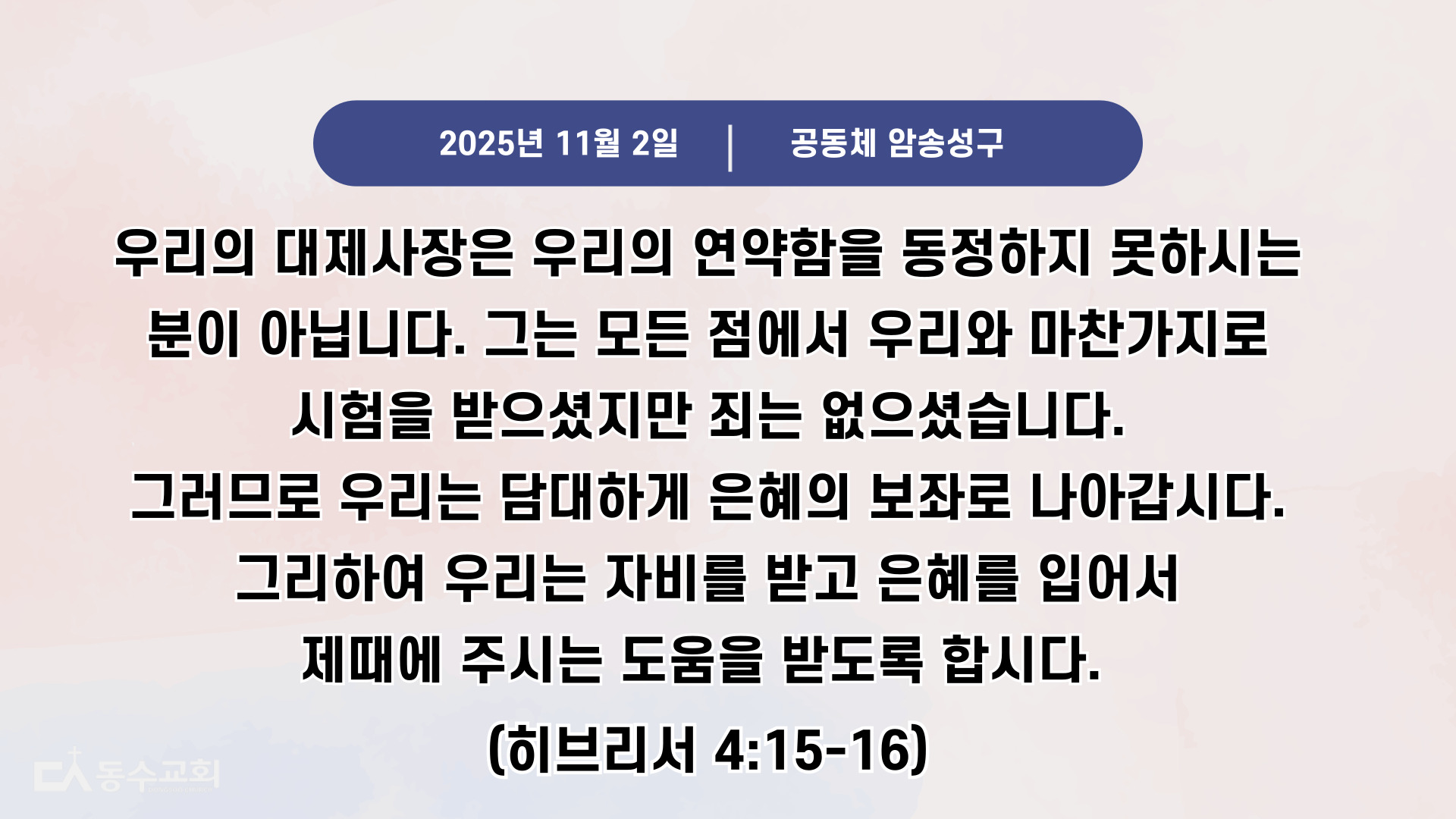 3. 오늘은 성찬주일입니다. 성찬의 기쁨, 깊은 은혜와 감동 가득한 예배를 드립시다.