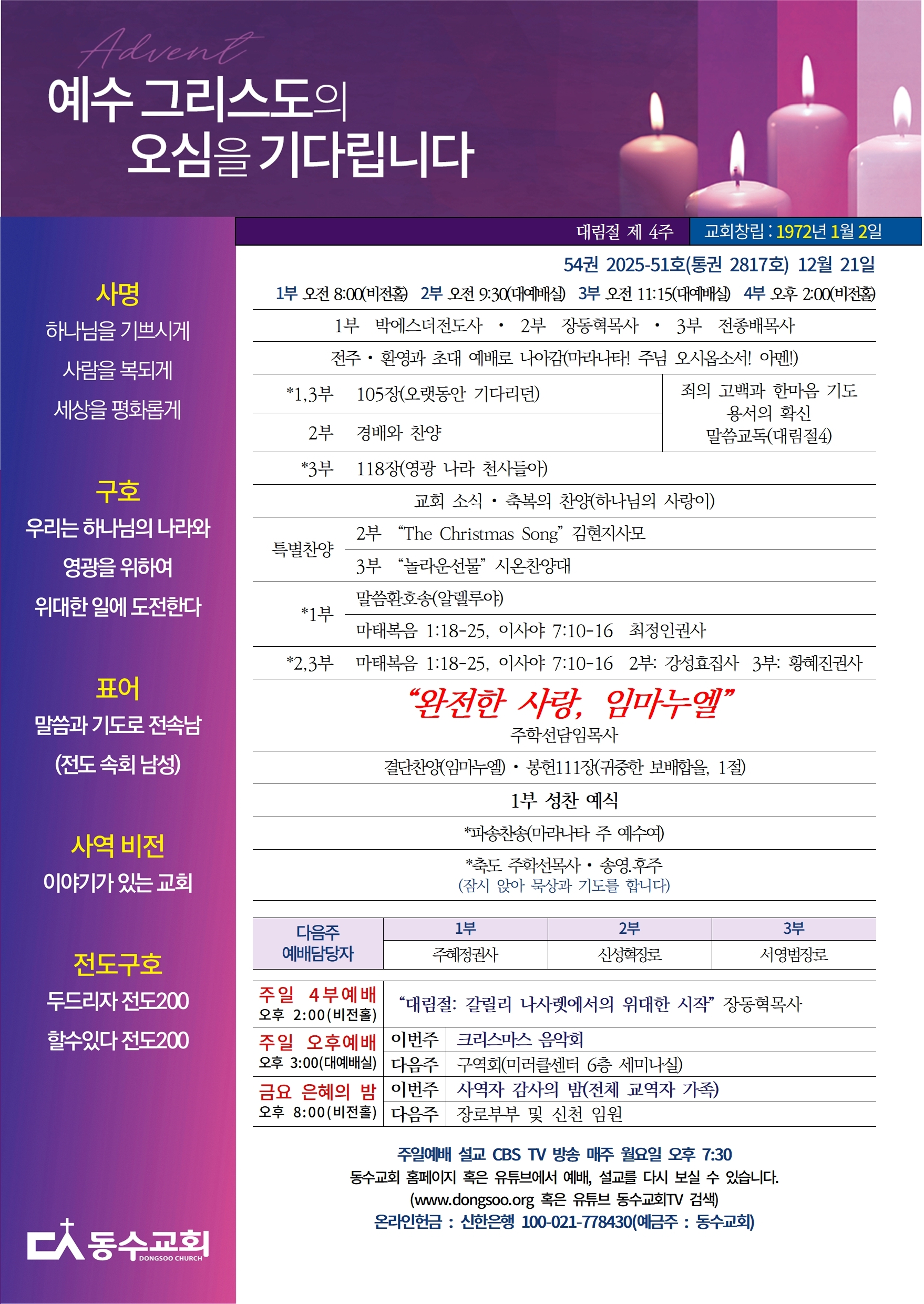 | 12/24(수) | 미가 4:1-13 | 장동혁목사 |