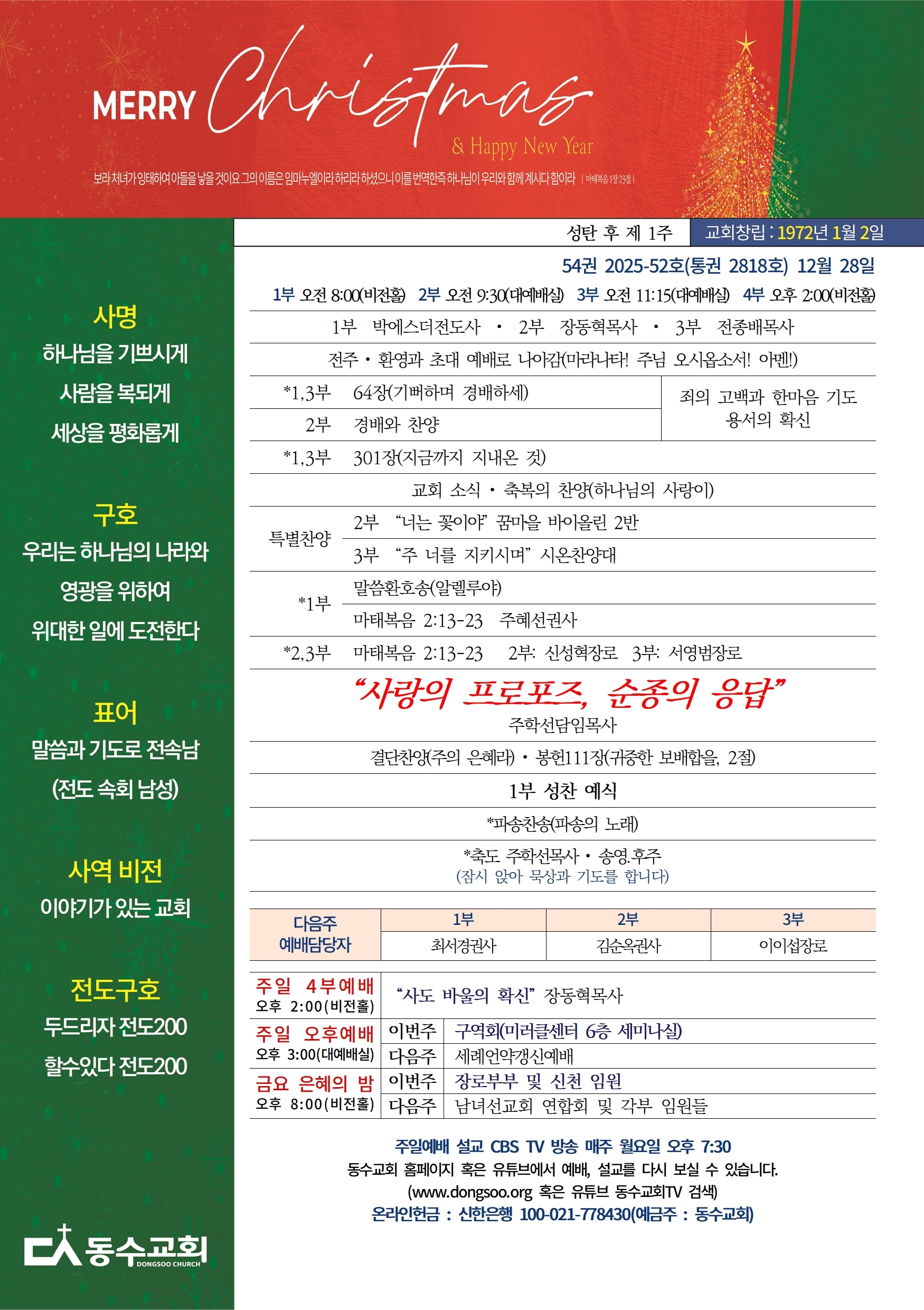 | 12/28(주일) | 미가서 7:14-20 | 개인기도 |