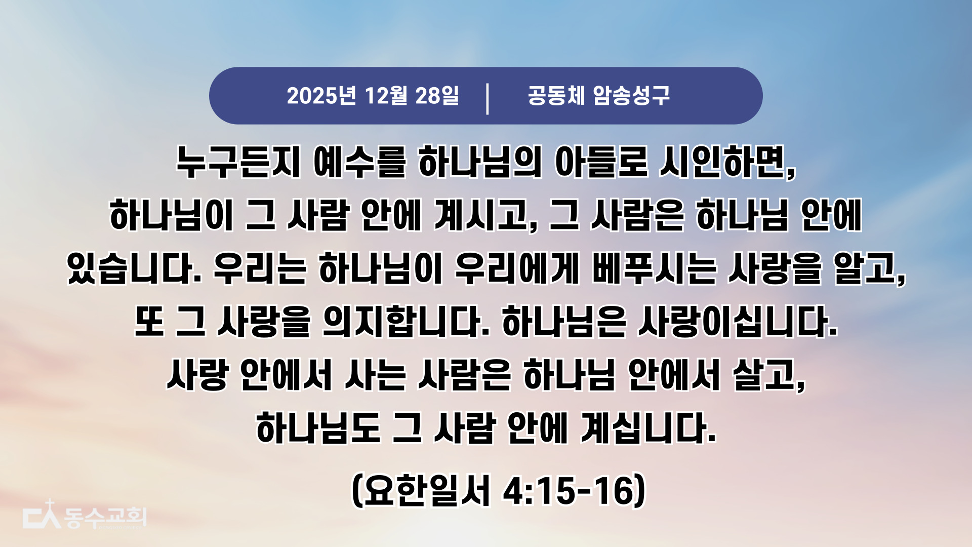 ◾ 누구든지 예수를 하나님의 아들로 시인하면, 하나님께서 그 사람 안에 계시고, 그 사람은 하나님 안에 있습니다. 우리는, 하나님께서 우리에게 주시는 사랑을 알고, 믿었습니다. 하나님은 사랑이십니다. 사랑 안에 있는 사람은 하나님 안에 있고, 하나님도 그 사람 안에 계십니다.(요한일서 4:15-16)