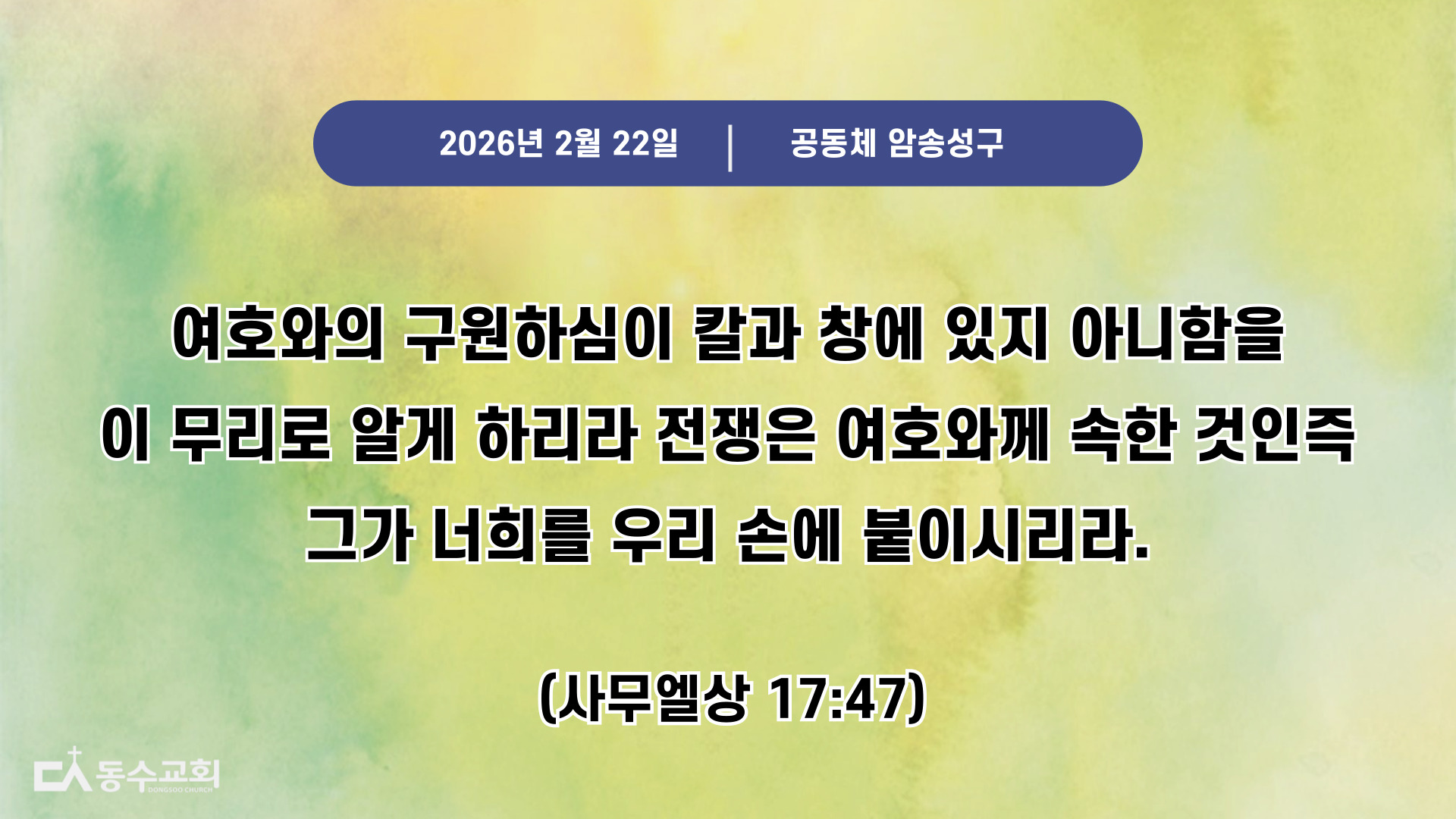 7. 금주의 암송구절 : 여호와의 구원하심이 칼과 창에 있지 아니함을 이 무리로 알게 하리라 전쟁은 여호와께 속한 것인즉 그가 저희를 우리 손에 붙이시리라(사무엘상 17:47)