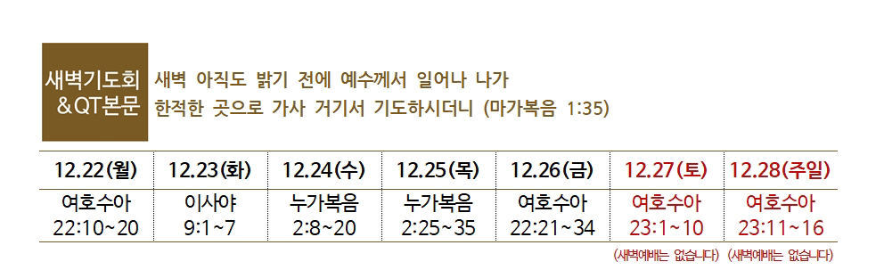 5. 송구영신예배 : 31(수) 밤 11:00. 온 가족이 함께 예배를 드리며 새해를 맞이합니다.