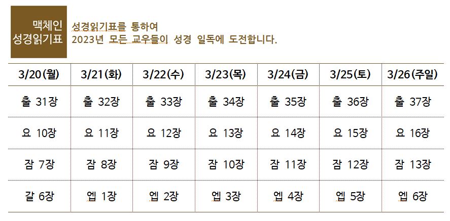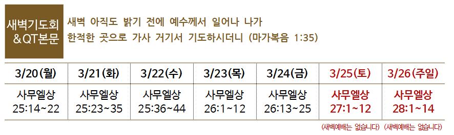26일(주일) 1마을 9,11목장 / 28일(화) 2마을 3목장 / 30일(목) 2마을 10목장