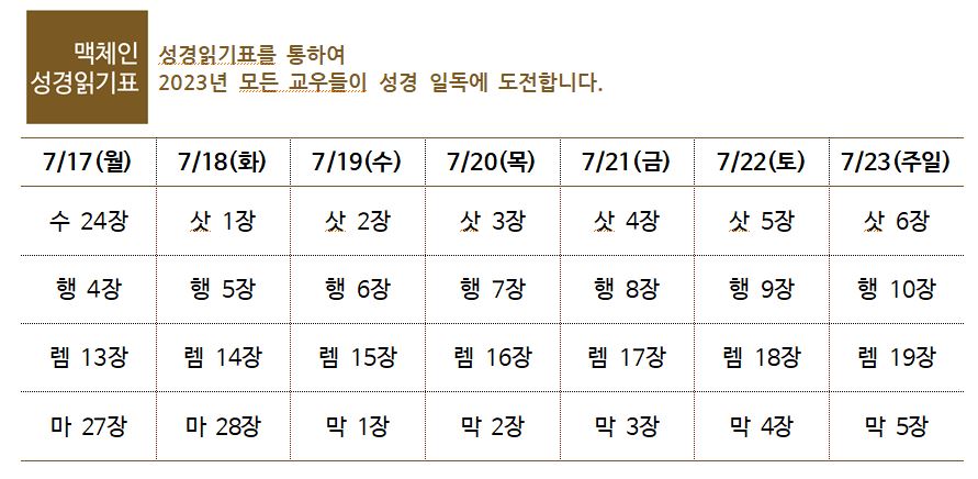 1. 7월에도 하나님이 우리나라, 가정, 교회, 일터를 돌보아주시고, 우리에게 맡기신 일을 신실하게 감당하여 선한 열매를 맺기 원합니다.