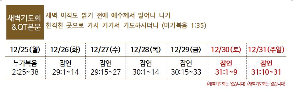 | 12월 31일 | 1월 7일 | 1월 14일 | |
