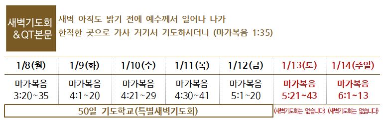 5. 50일 기도학교(특별새벽기도회) : 2024. 1.2(화)~3.1(금), 새벽 5:00, 금요기도회(오후 8:30).