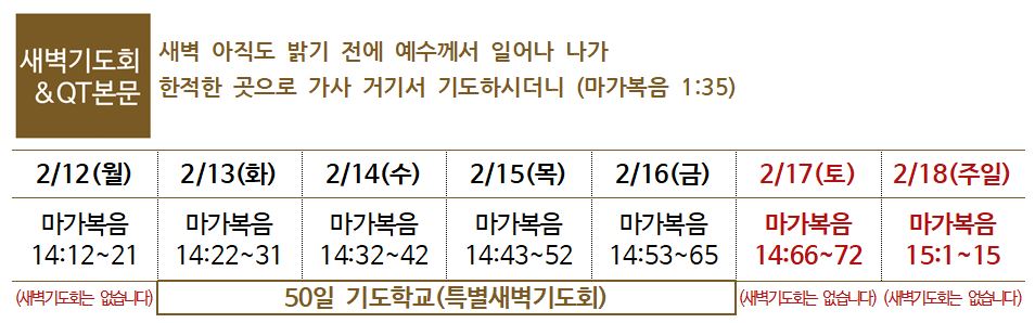 4. 설 연휴기간 예배 안내 : 오늘 오후예배와 내일(12일) 새벽 50일 기도학교는 없습니다.