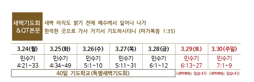 4. 40일 기도학교 : 3.4(화)~4.18(금) 매일 오전 5:00. 금요기도회(오후 8:30) (주제 : 성령세례)