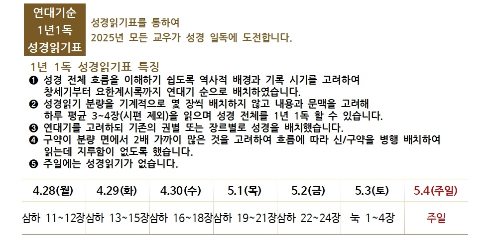 - 실버성경학교 : 5.10(토) 9:30(70세 이상) 교육부 주관
