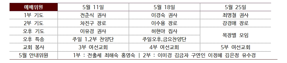 1. 5월에 우리 가정에 화목과 충만한 기쁨이 있도록 인도해주시고, 또 하나의 가정인 우리교회를 통해 우리의 영혼이 소생하기를 원합니다.