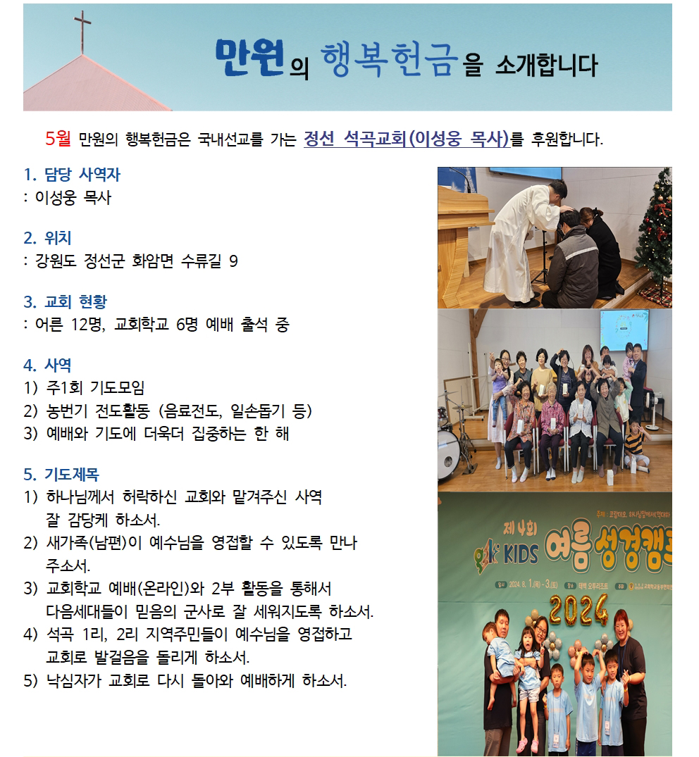 6. 5월 만원의 행복 헌금 : 정선 석곡교회를 돕습니다. (주보에 있는 석곡교회 소개 참고)