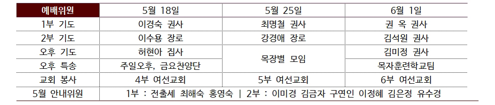 1. 5월에 우리 가정에 화목과 충만한 기쁨이 있도록 인도해주시고, 또 하나의 가정인 우리교회를 통해 우리의 영혼이 소생하기를 원합니다.