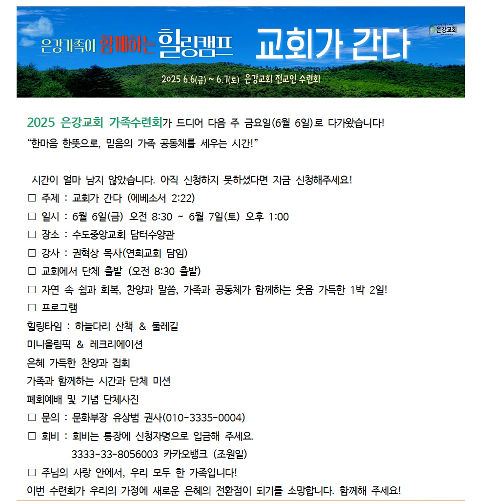 3. 6월 6일(금)~7일(토) 전교인 수련회를 통해 우리 교회에 가족 같은 사랑이 흘러가게 해주시고, 교회의 정체성과 사명을 바로 세우는 기회가 되기를 원합니다.