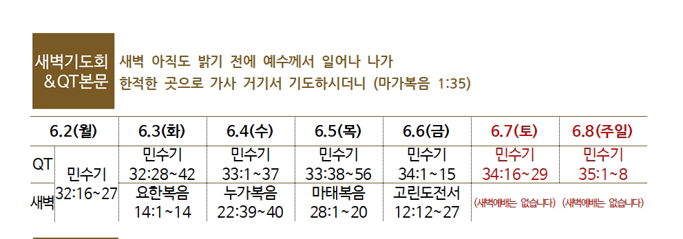 ❶ 6월 새날(월삭)기도회 : 2일(월) 오전 5:00. 주최 : 집사