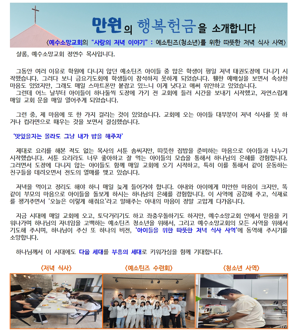 7월의 만원의 행복 헌금 : 예수소망교회(담임목사 : 정연수목사) ‘사랑의 저녁이야기’ 사역을