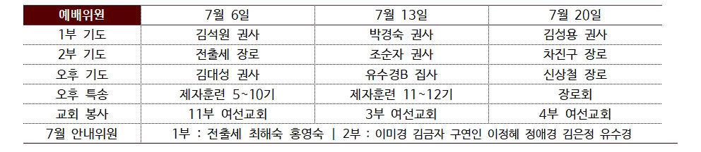 | 유아유치부 | 나는 하나님을 예배해요 | 7.26(토)~27(주일) | 유아유치부실 |