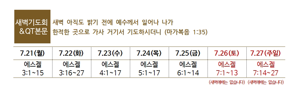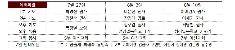 | 유아유치부 | 나는 하나님을 예배해요 | 7.26(토)~27(주일) | 유아유치부실 |