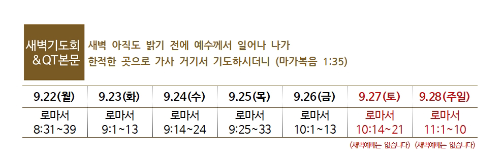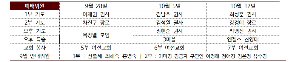 | 청년부 | 1단계 9.21(주일)~ 4주 과정 | 2단계 9.10(수)~ 15주 과정 |