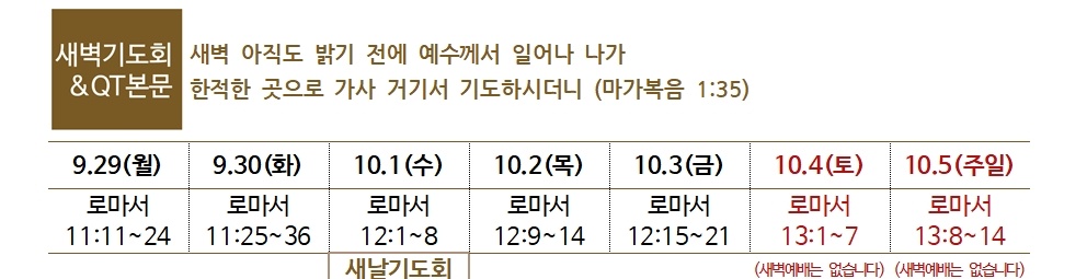 ❷ 10월 새날(월삭)기도회 : 10.1(수) 오전 5:00. (특송 : 청년부)