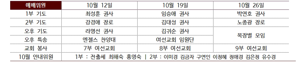 1. “하나님, 10월 한 달도 우리 가정, 일터, 교회, 우리나라를 질서 있게 세워주십시오”