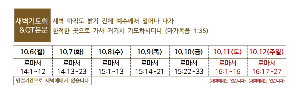❸ 추석 명절 기간 예배 : 오늘 오후예배와 점심식사, 월(6일), 화(7일) 새벽예배는 없습니다.