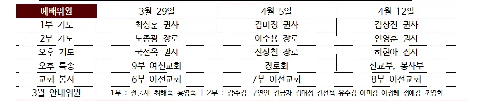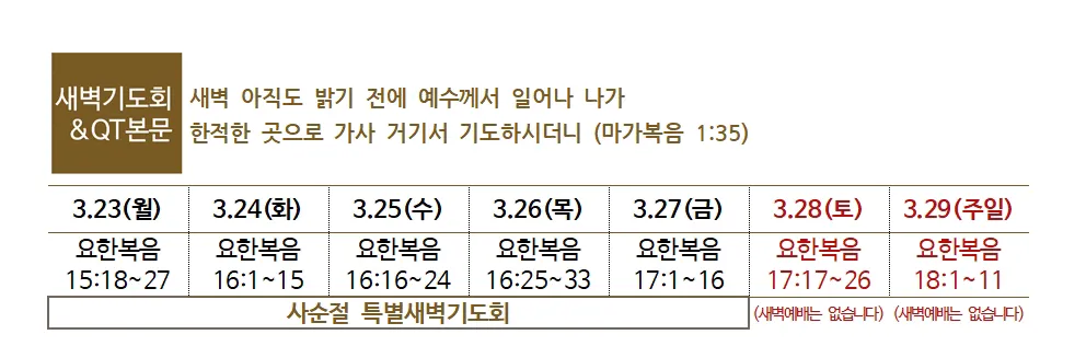 3. 사순절 특별새벽기도회 : 2.23(월)~4.3(금) 매일 새벽 5:00에 있습니다.