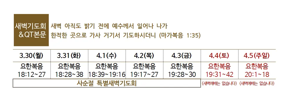 5. 사순절 특별새벽기도회 : 2.23(월)~4.3(금) 매일 새벽 5:00에 있습니다.