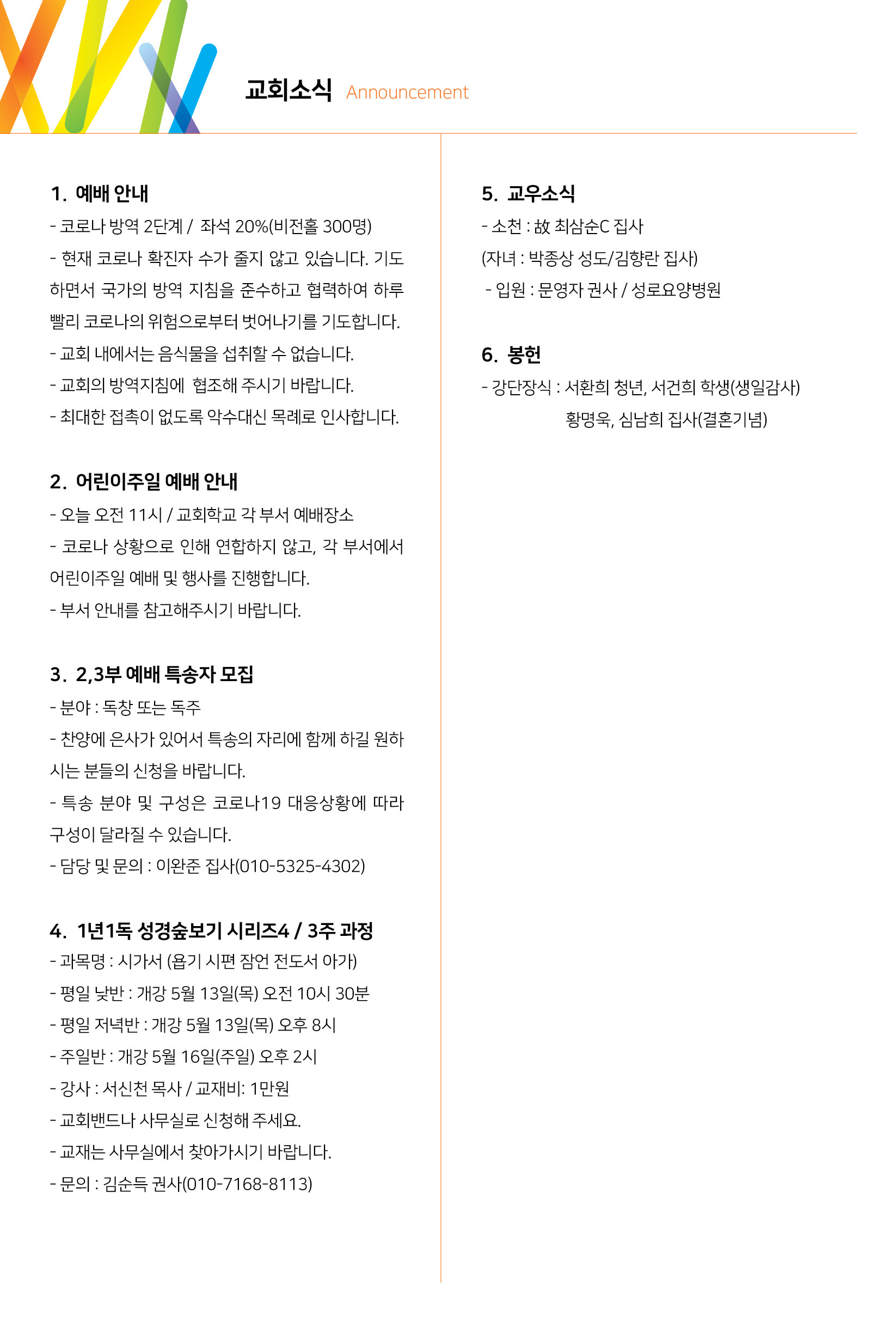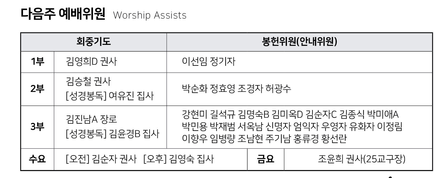 기도 : (오전) 안유정 권사 / (오후) 최삼순A 권사