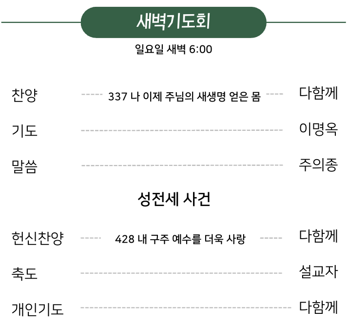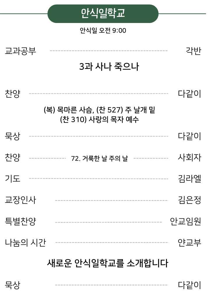 교과공부(9am 각반), 안식일학교 (9:50am)