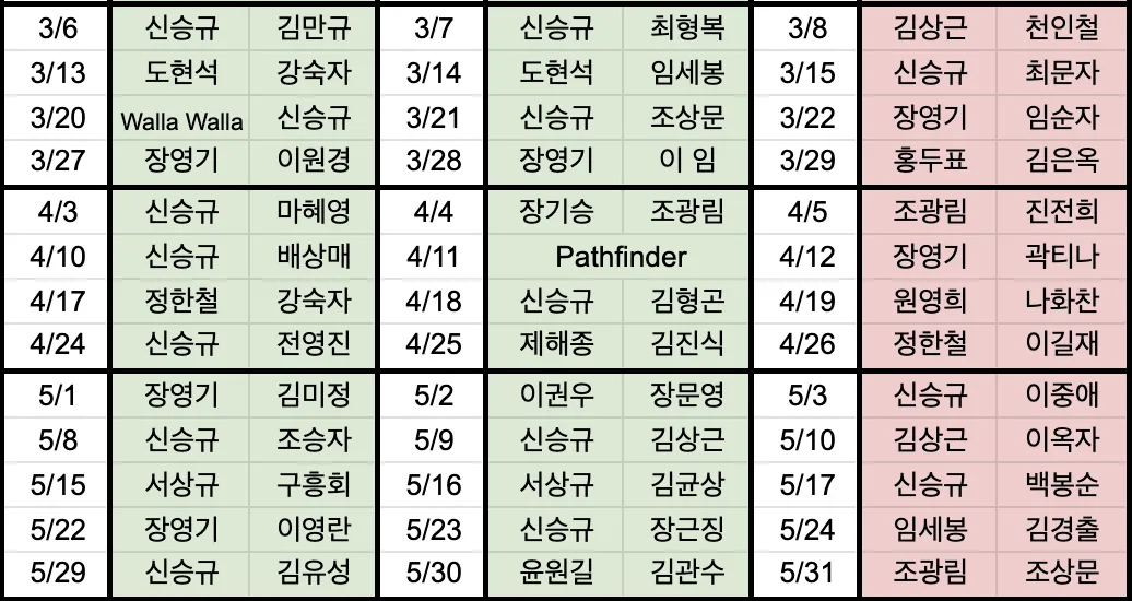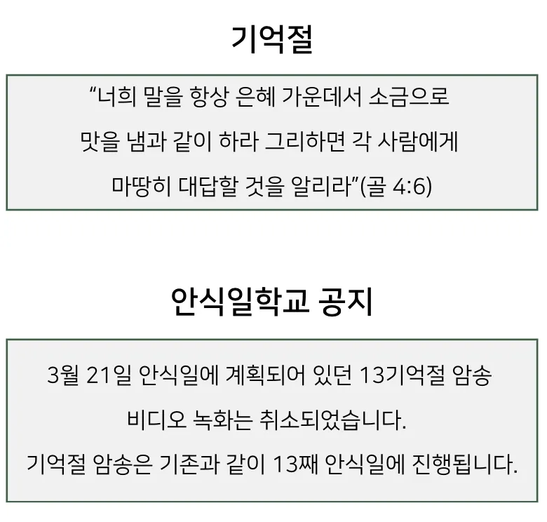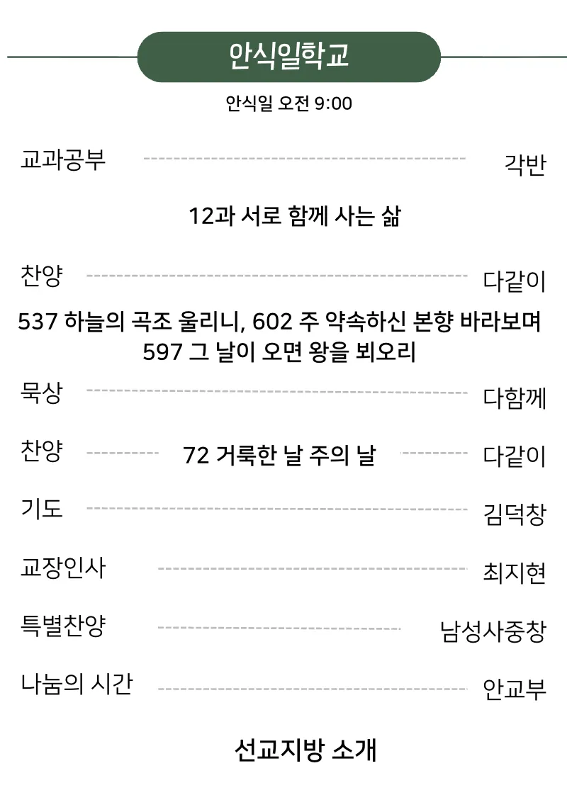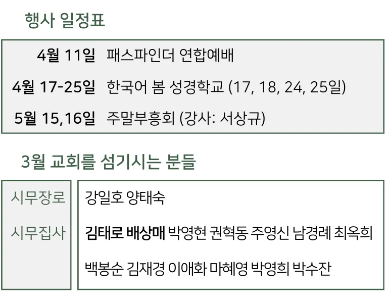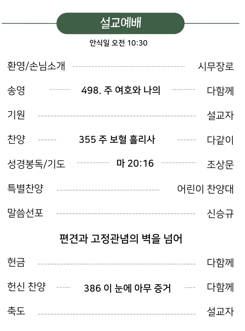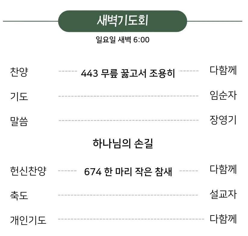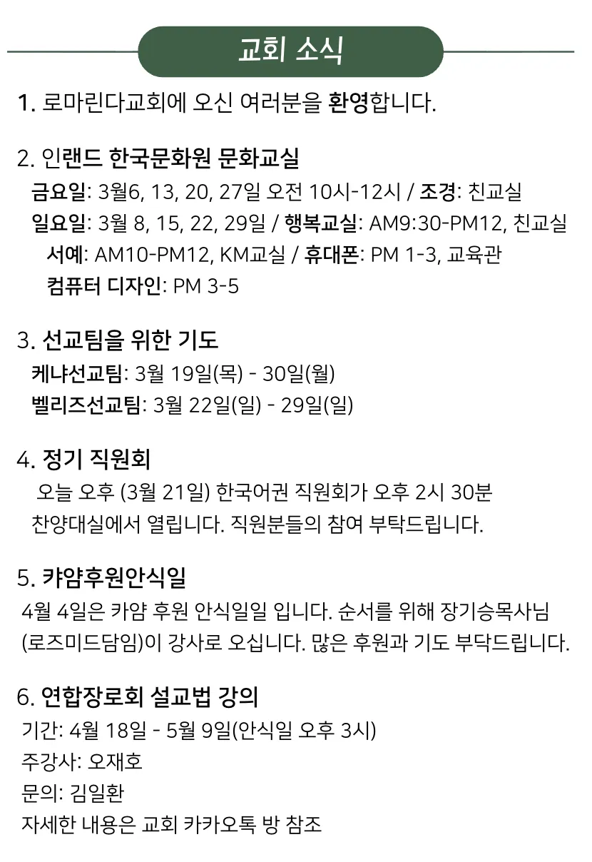 금요예배 안식일학교 설교예배 새벽기도회 광고 및 일정 금요일 저녁 7시 30분 안식일 아침 9시 안식일 오전 10시 30분 일요일 새벽 6시 로마린다 교회 소식 예배 배정표 국어부 일정 이름과 이메일을 등록하시면 주보가 발행될 때 미리 이메일로 보내드립니다. 이름 이메일 구독 신청 로마린다한국인재림교회 담임목사 : 신승규 909-616-6833 11487 New Jersey St, Redlands, CA92373 https://www.llksda.org/