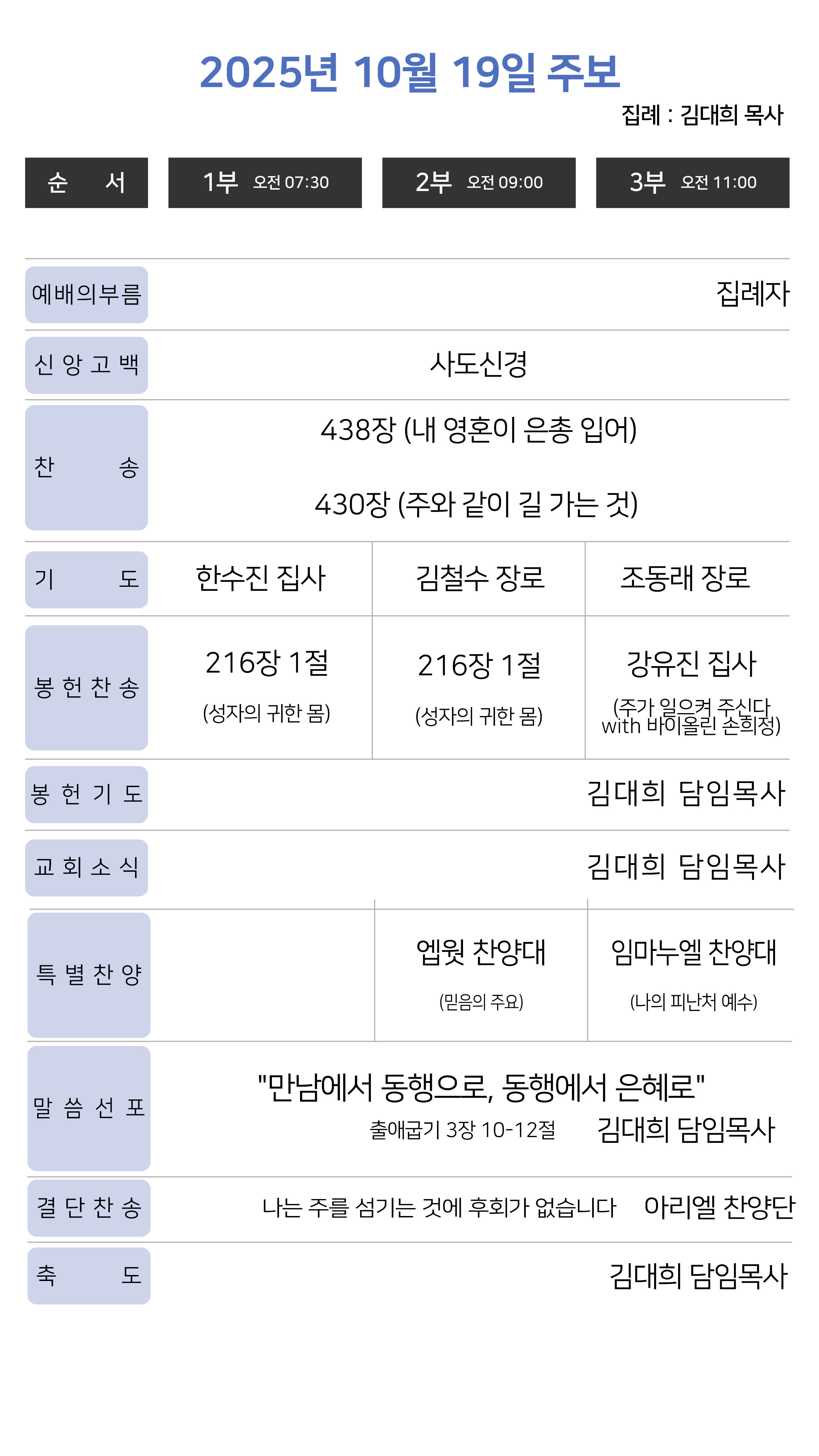 ♧ 주일애찬 담당 선교회는 주일 2부 예배 후 바로 주방으로 오시기 바랍니다.