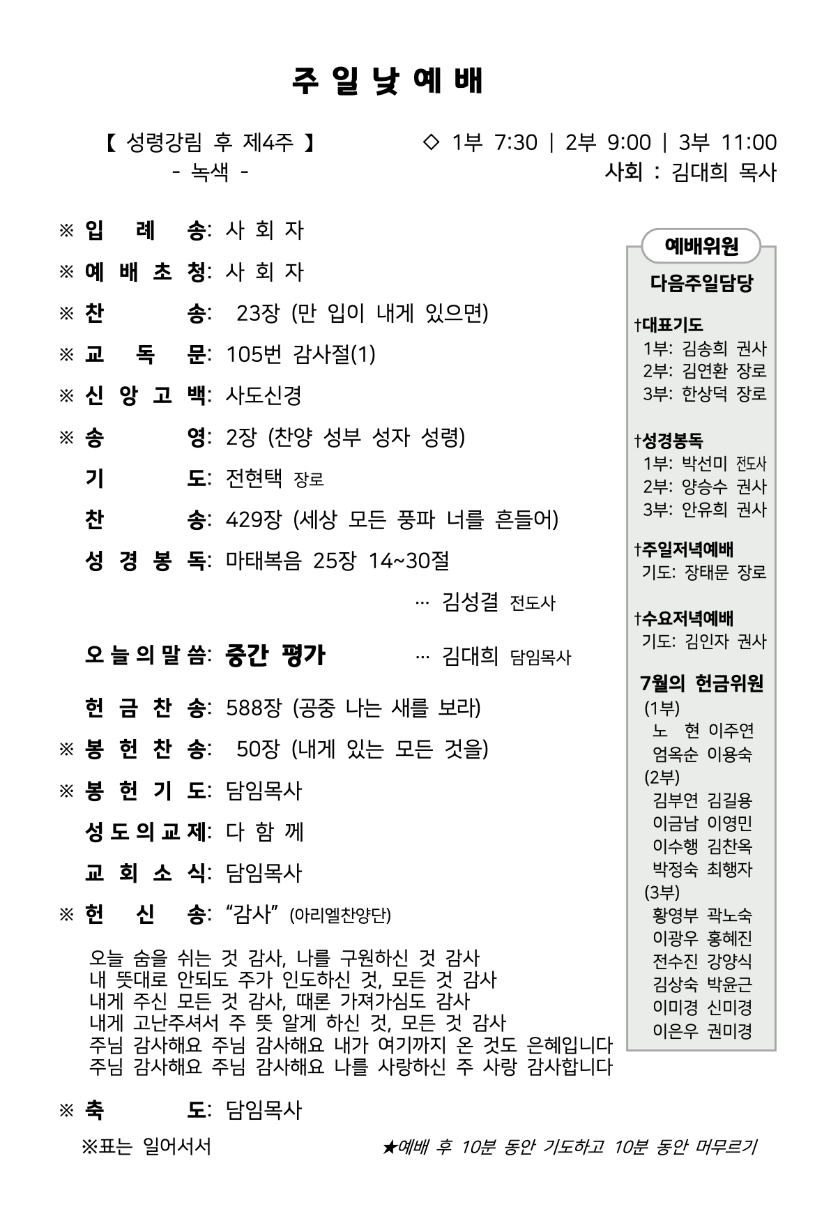 - 1주차 7월07일 : 유아교회 여름성경학교를 위한 기도회