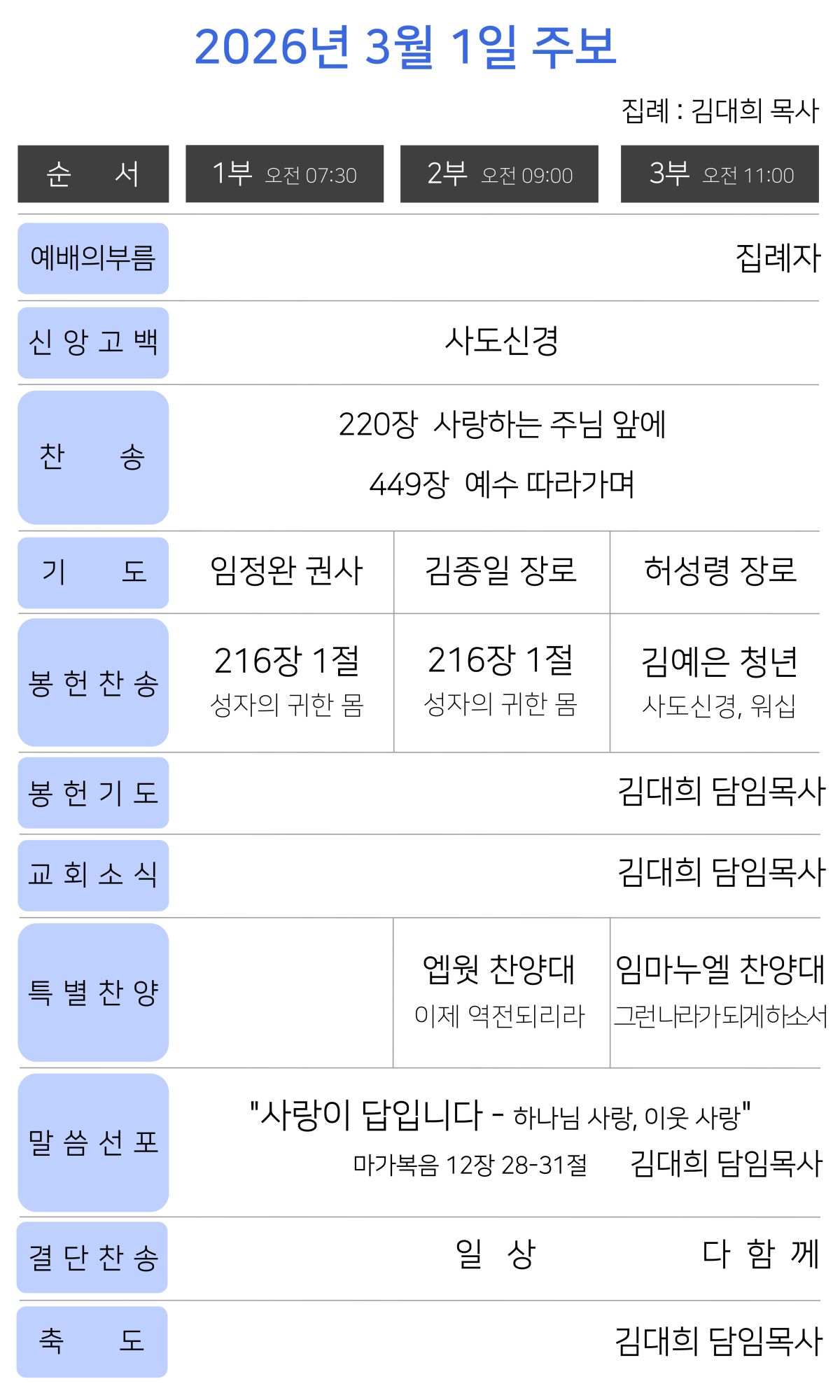 오후 7시 30분 | 집례 : 김대희 목사