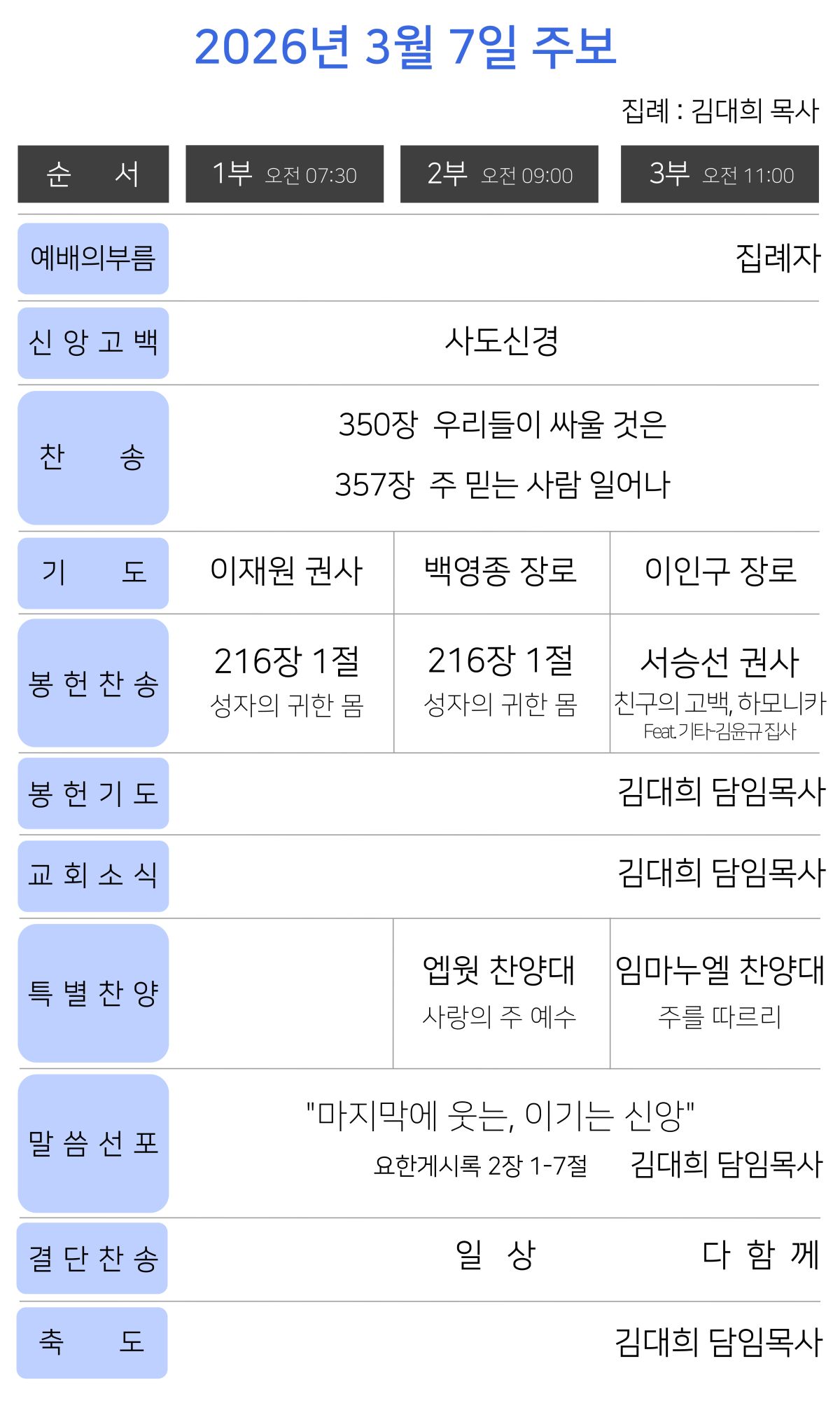 오후 7시 30분 | 집례 : 김대희 목사