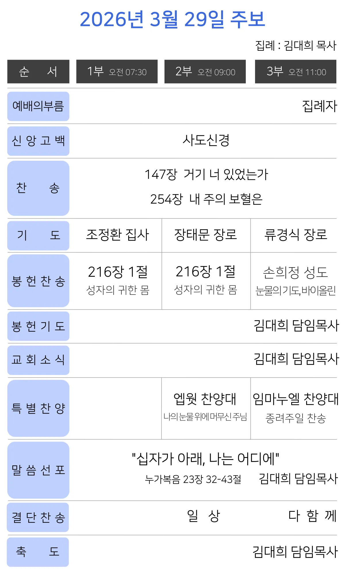 오후 7시 30분 | 집례 : 김대희 목사