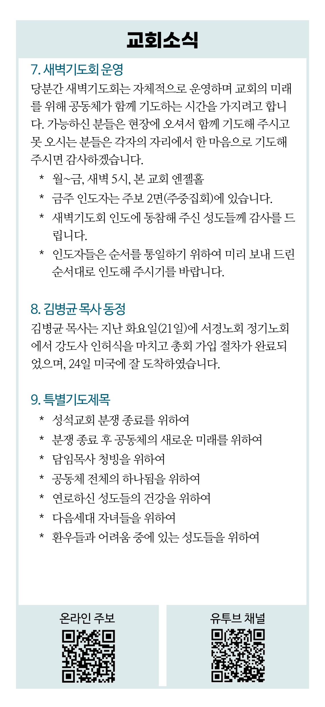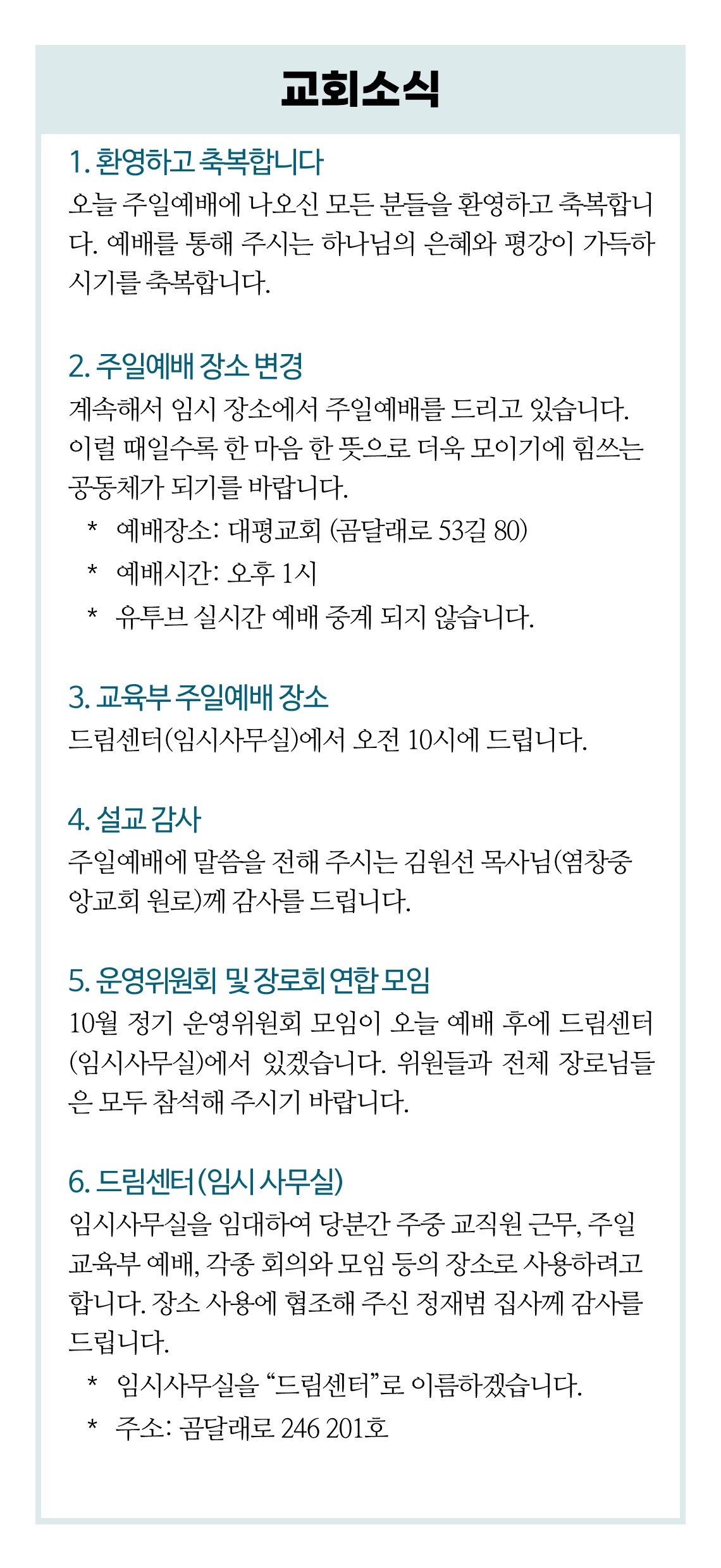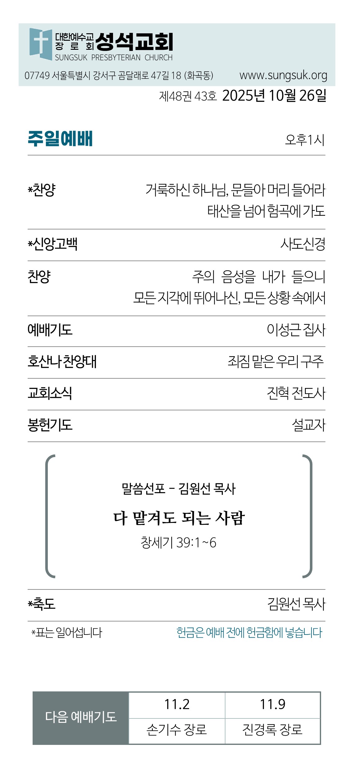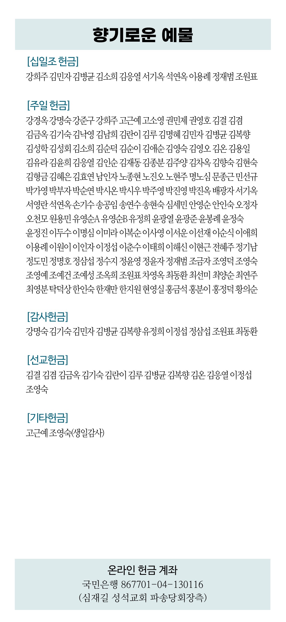 주일예배 주중집회 교회소식 향기로운예물 예배안내 섬기는이들 지난설교 이름과 이메일을 등록하시면 주보가 발행될 때 미리 이메일로 보내드립니다. 이름 이메일 구독 신청 SUNGSUKCHURCH 07749 서울 강서구 곰달래로47길 18 성석교회