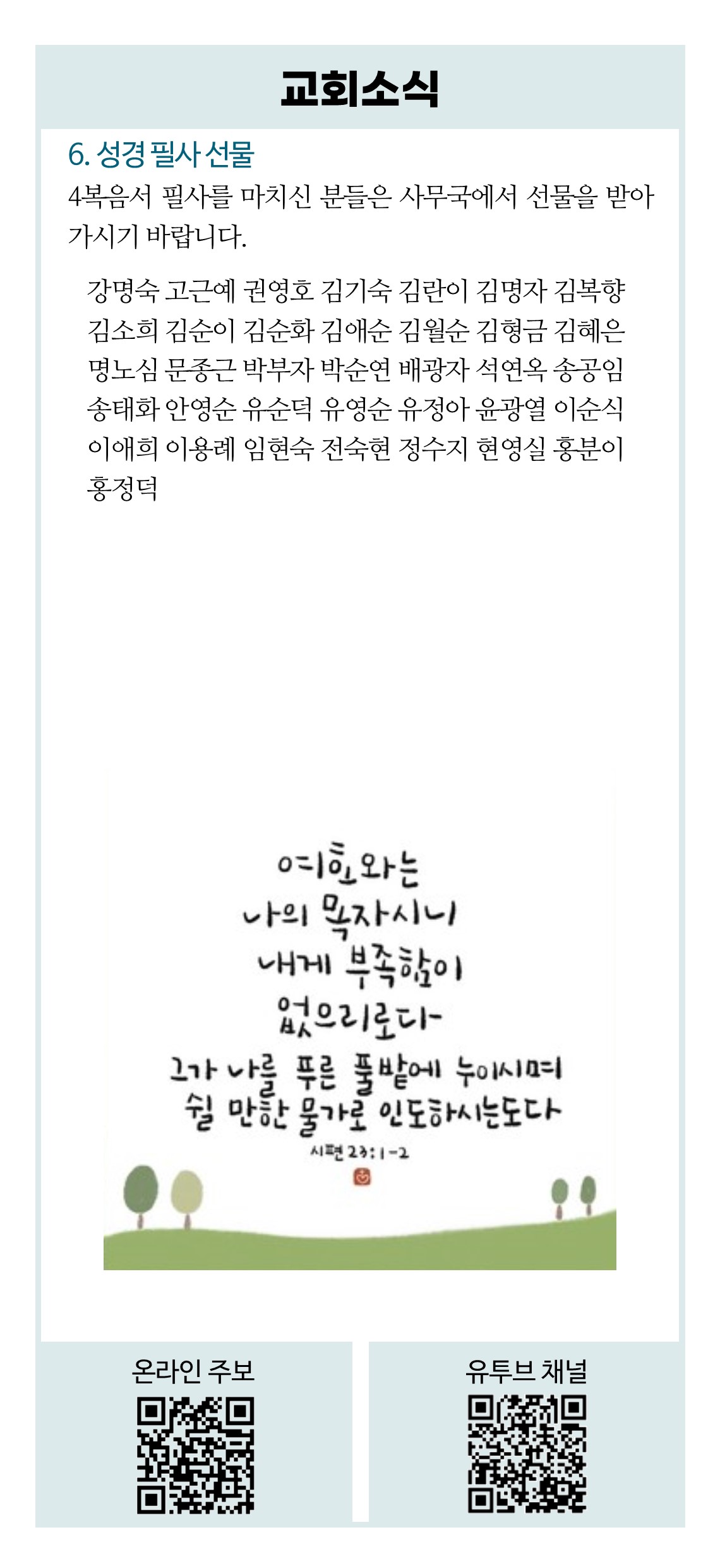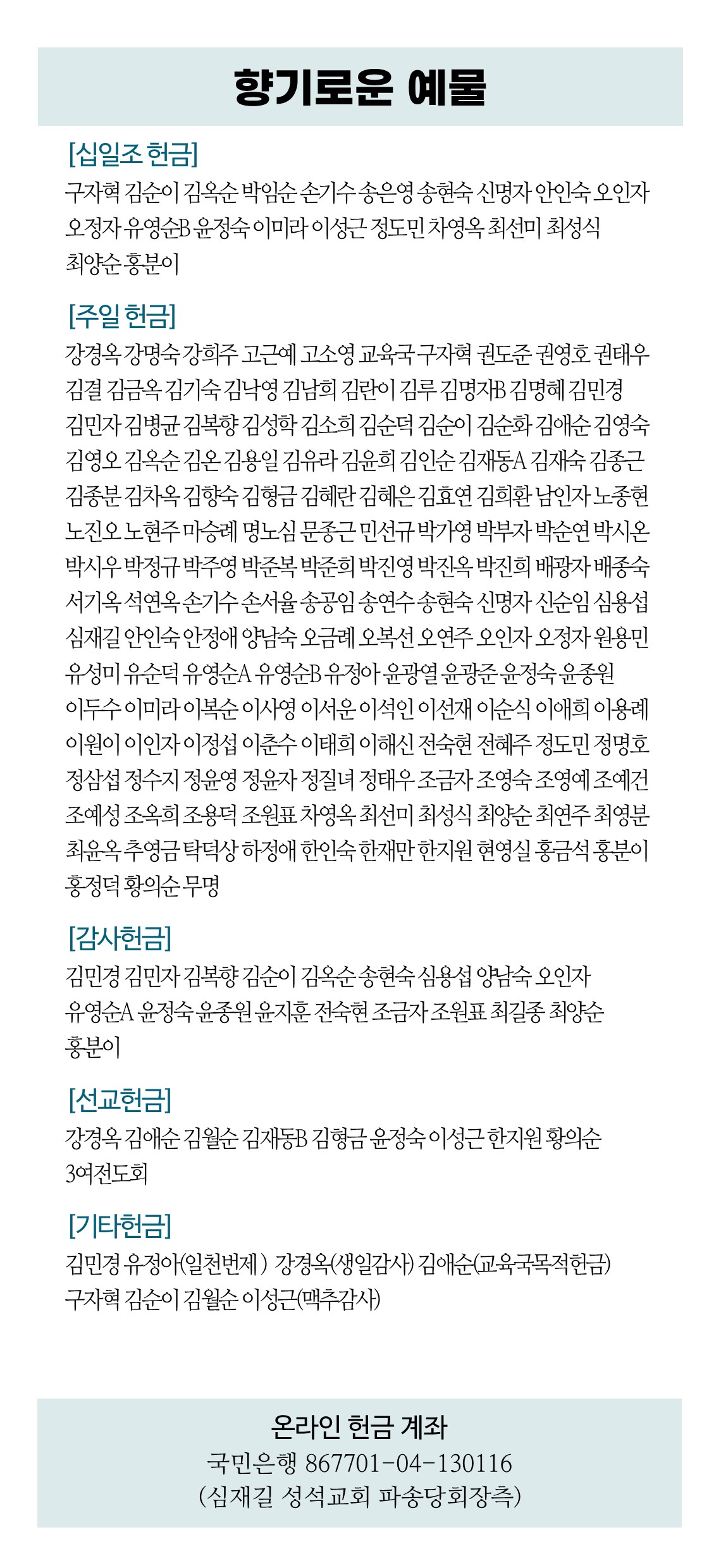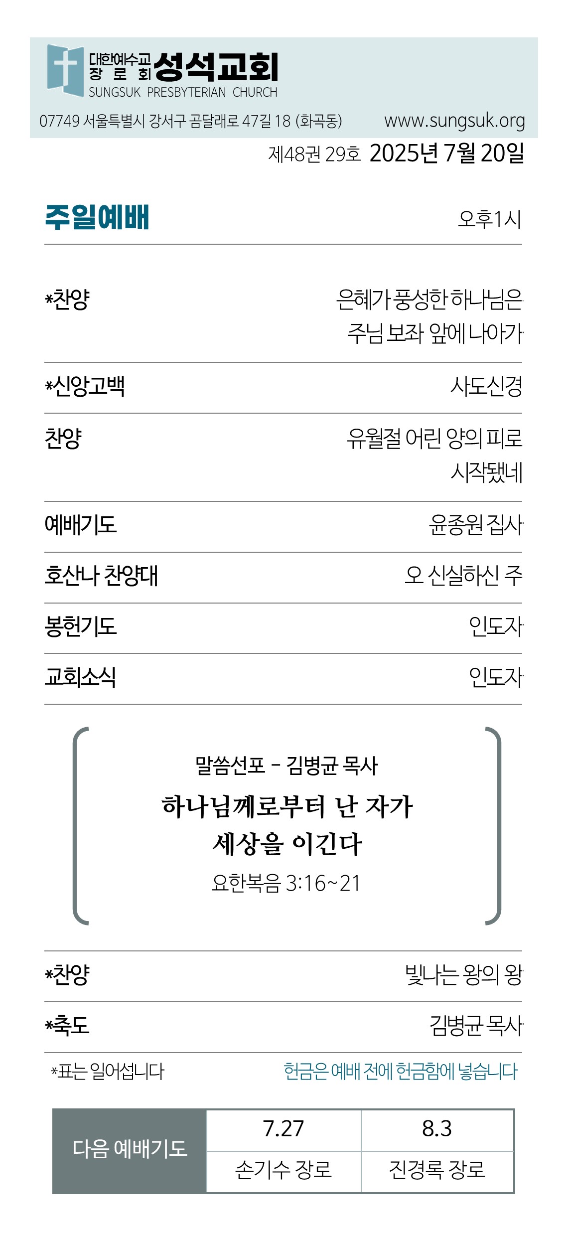 주일예배 주중집회 교회소식 향기로예물 예배안내 섬기는이들 지난설교 "> "> 이름과 이메일을 등록하시면 주보가 발행될 때 미리 이메일로 보내드립니다. 이름 이메일 구독 신청 SUNGSUKCHURCH 07749 서울 강서구 곰달래로47길 18 성석교회