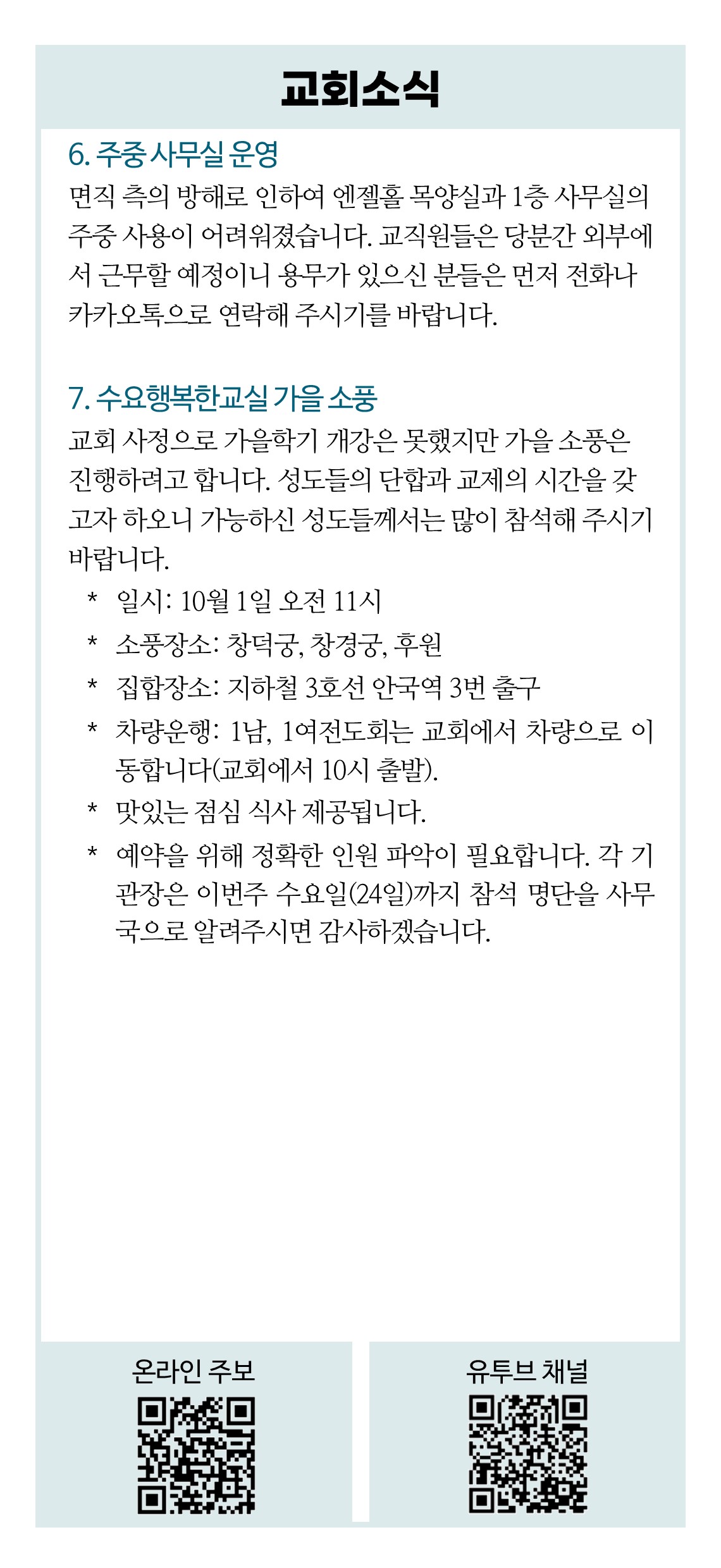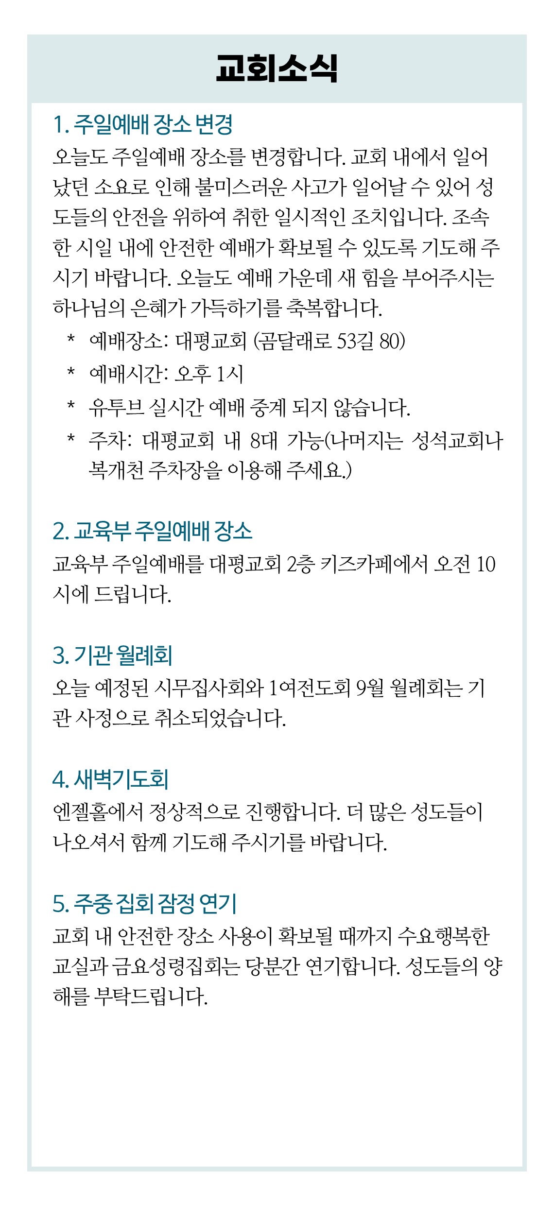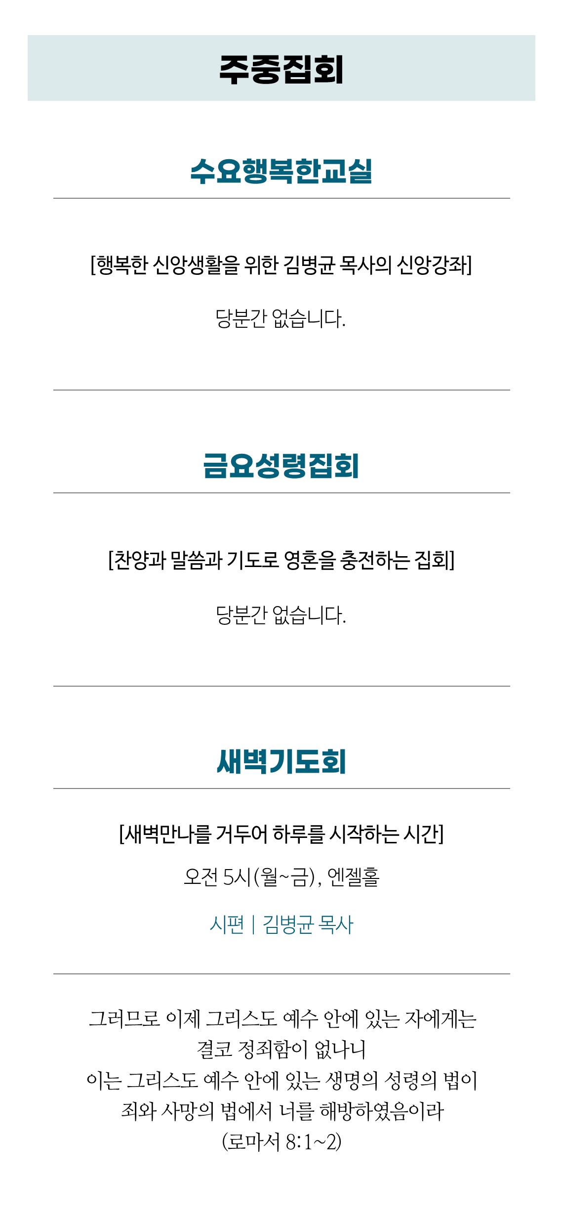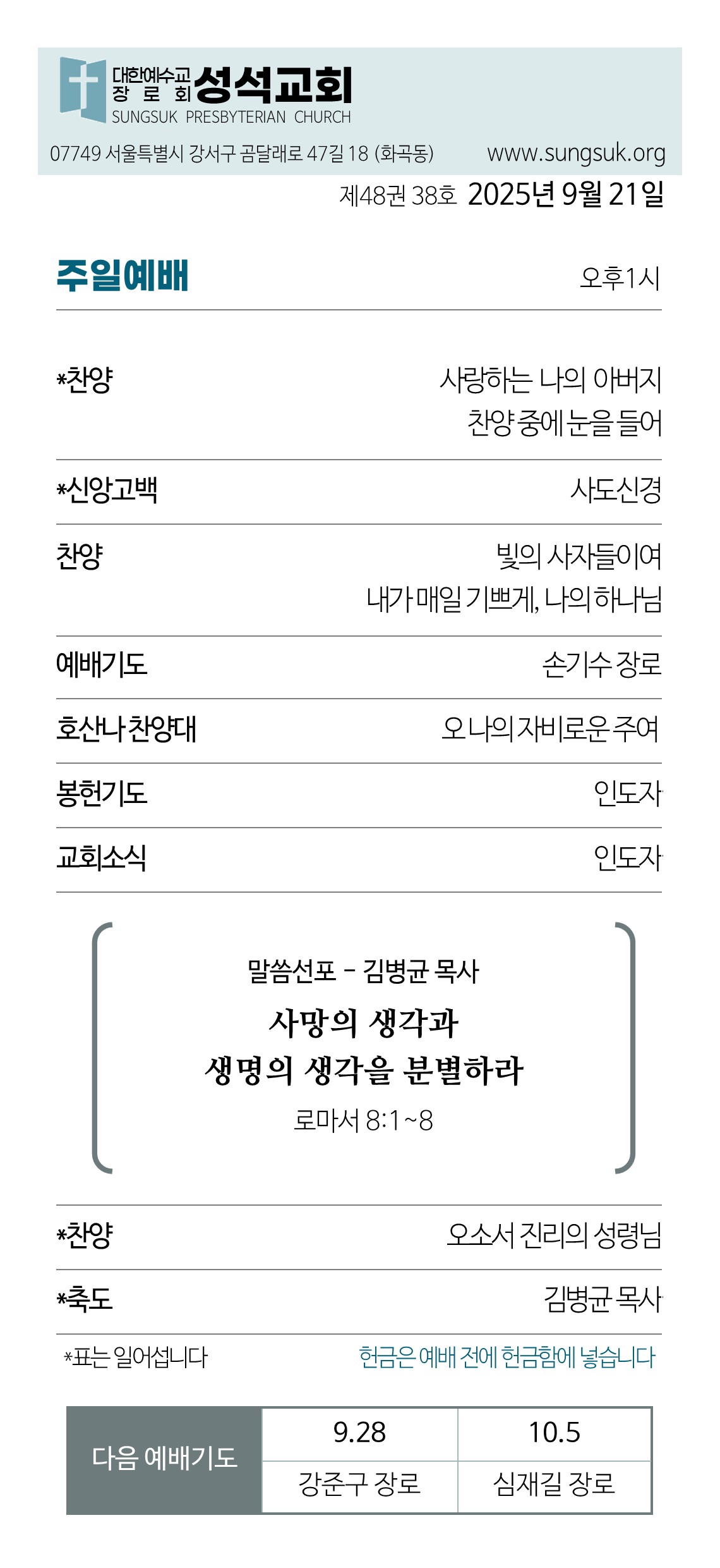 주일예배 주중집회 교회소식 향기로운예물 예배안내 섬기는이들 지난설교 이름과 이메일을 등록하시면 주보가 발행될 때 미리 이메일로 보내드립니다. 이름 이메일 구독 신청 SUNGSUKCHURCH 07749 서울 강서구 곰달래로47길 18 성석교회