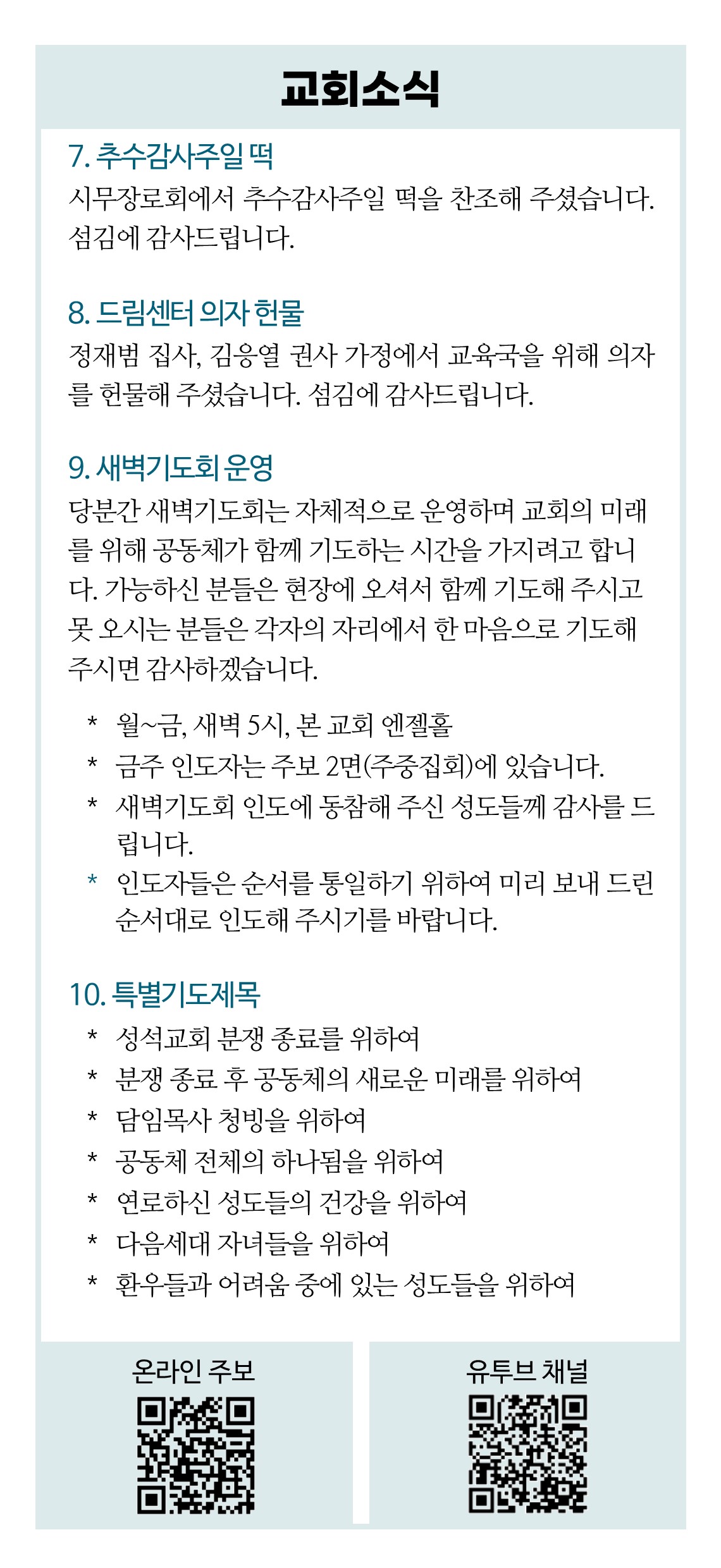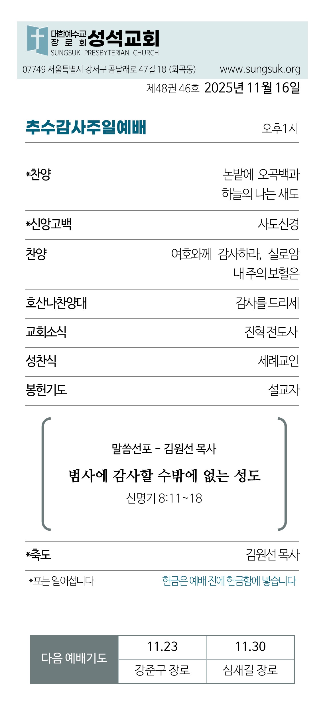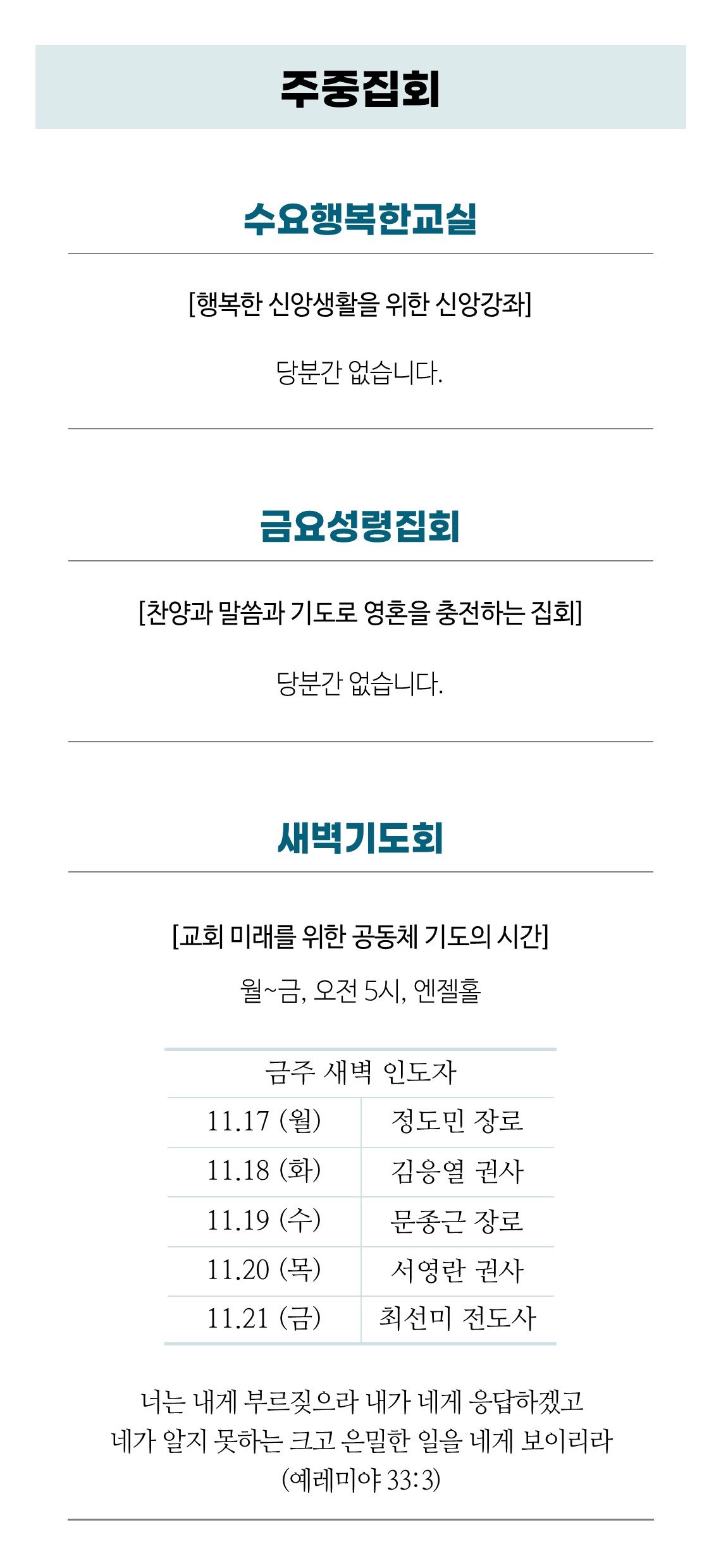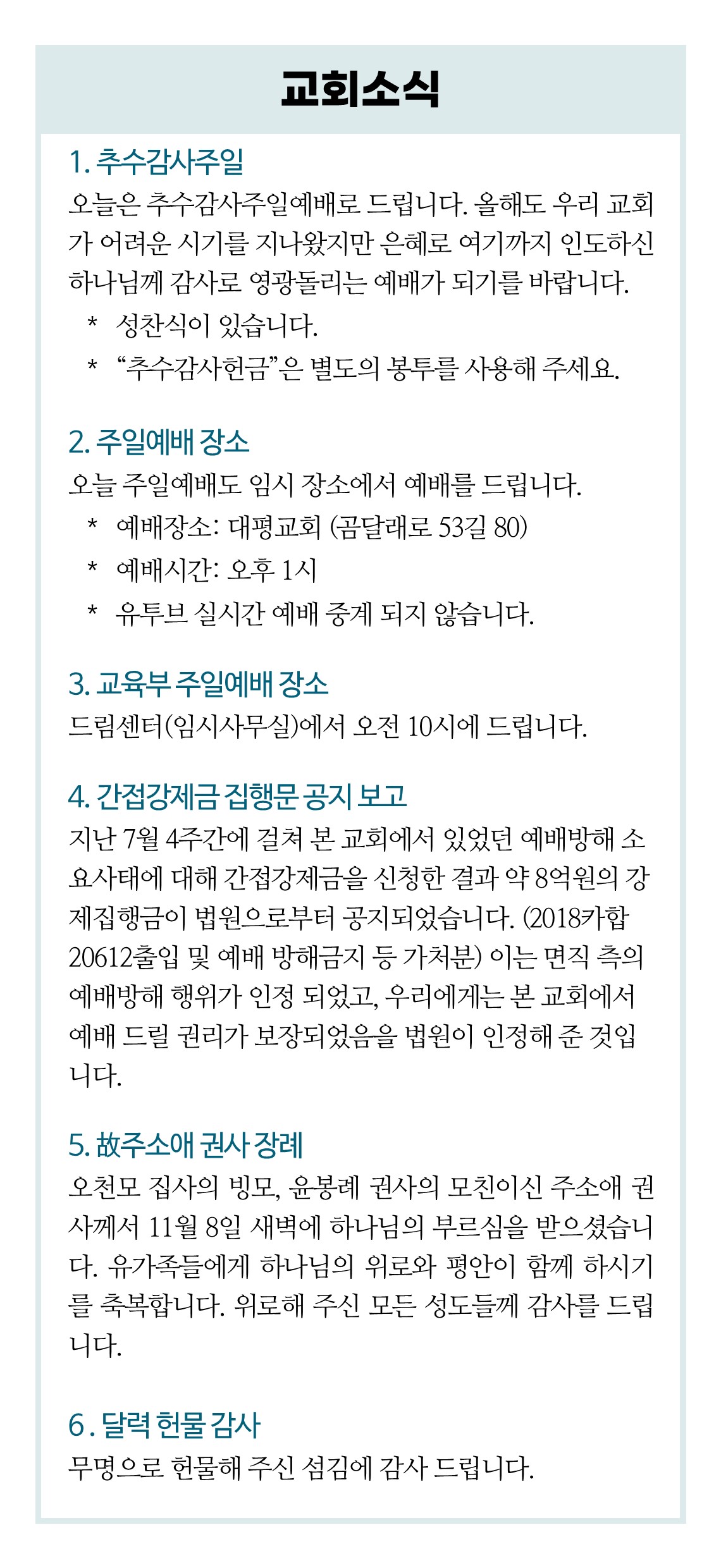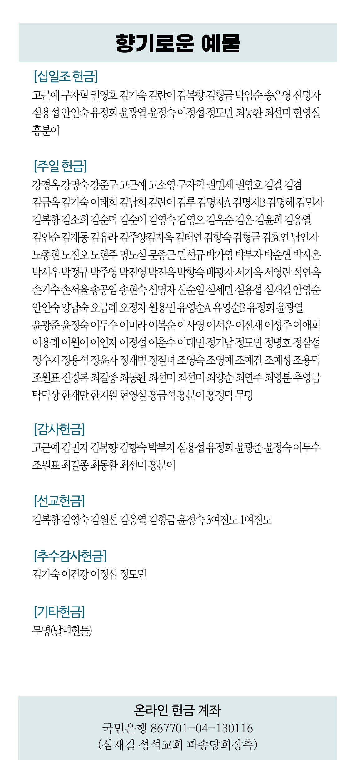 주일예배 주중집회 교회소식 향기로운예물 예배안내 섬기는이들 지난설교 이름과 이메일을 등록하시면 주보가 발행될 때 미리 이메일로 보내드립니다. 이름 이메일 구독 신청 SUNGSUKCHURCH 07749 서울 강서구 곰달래로47길 18 성석교회