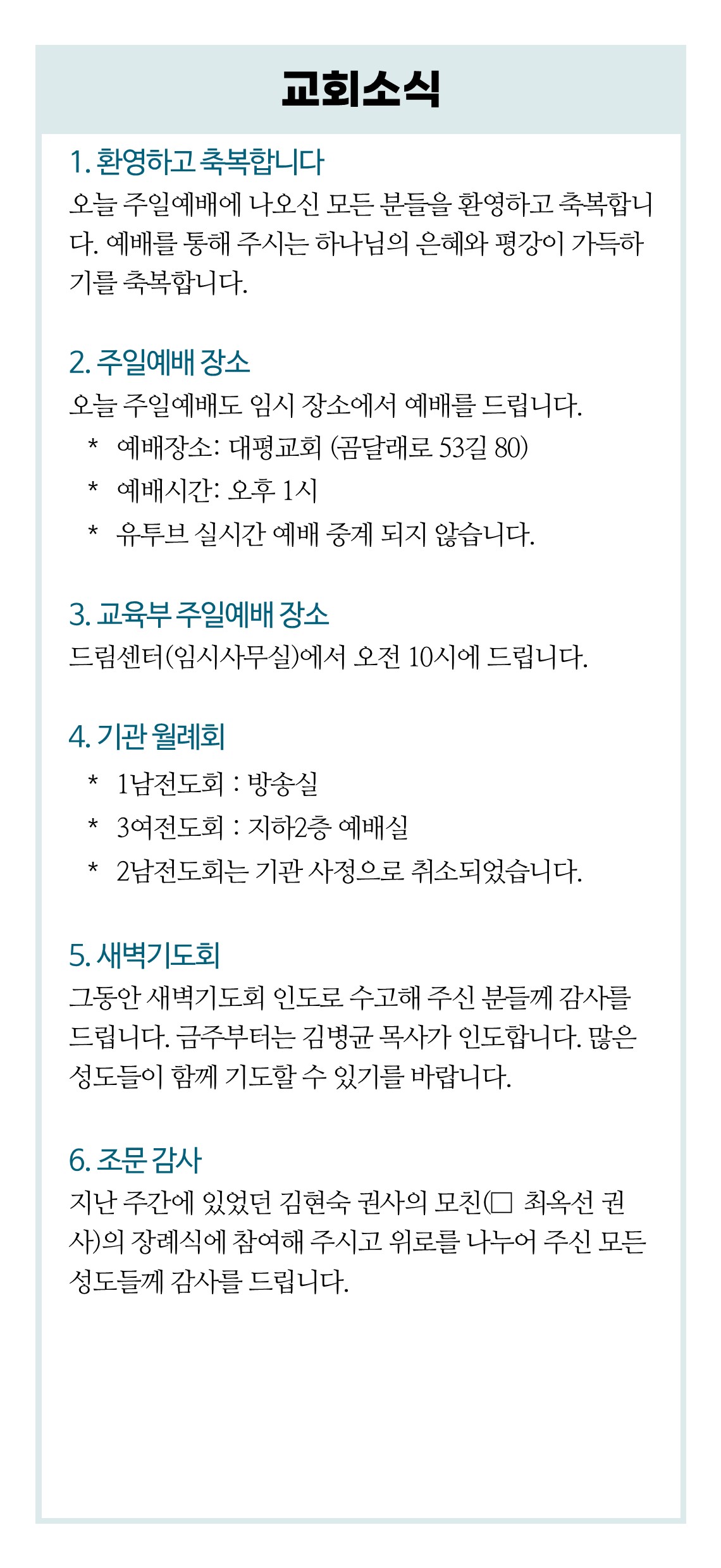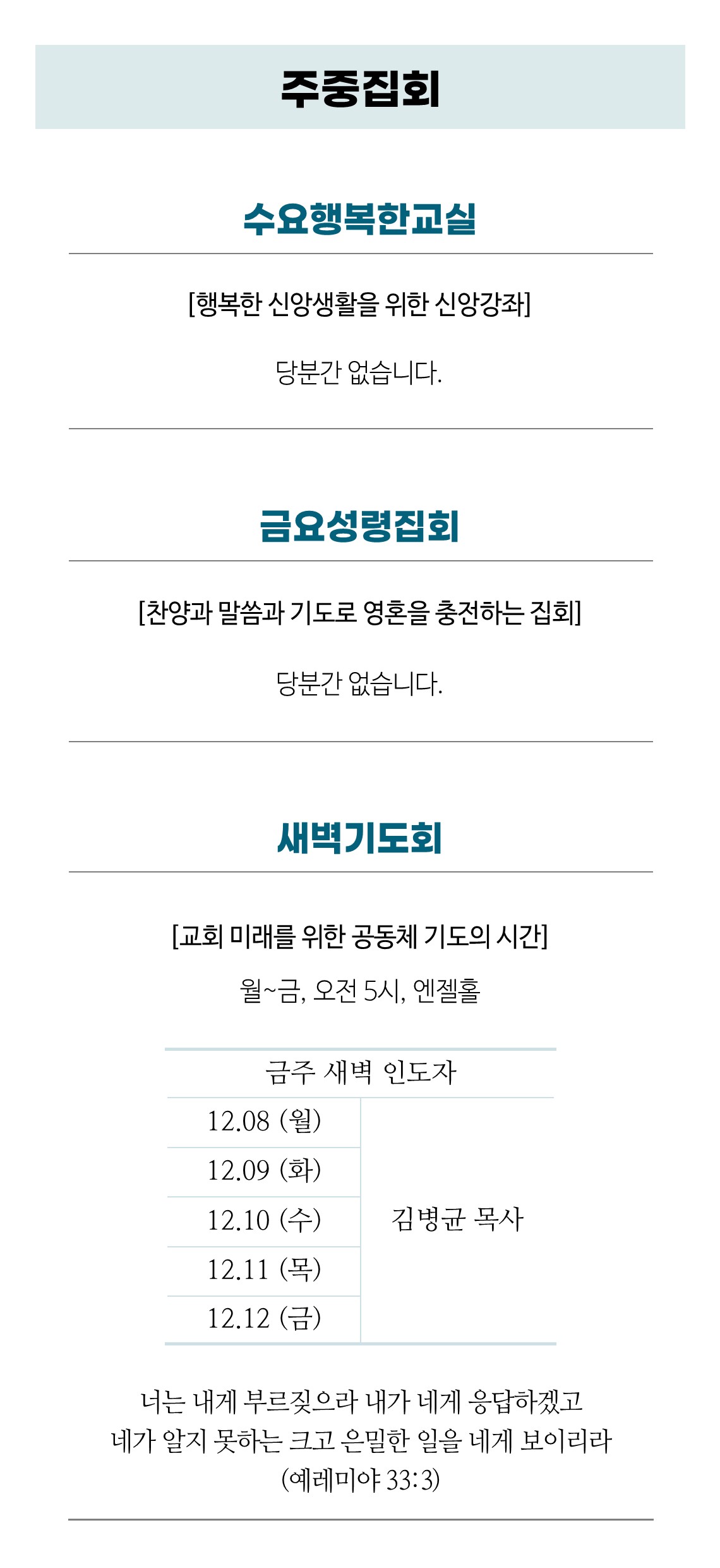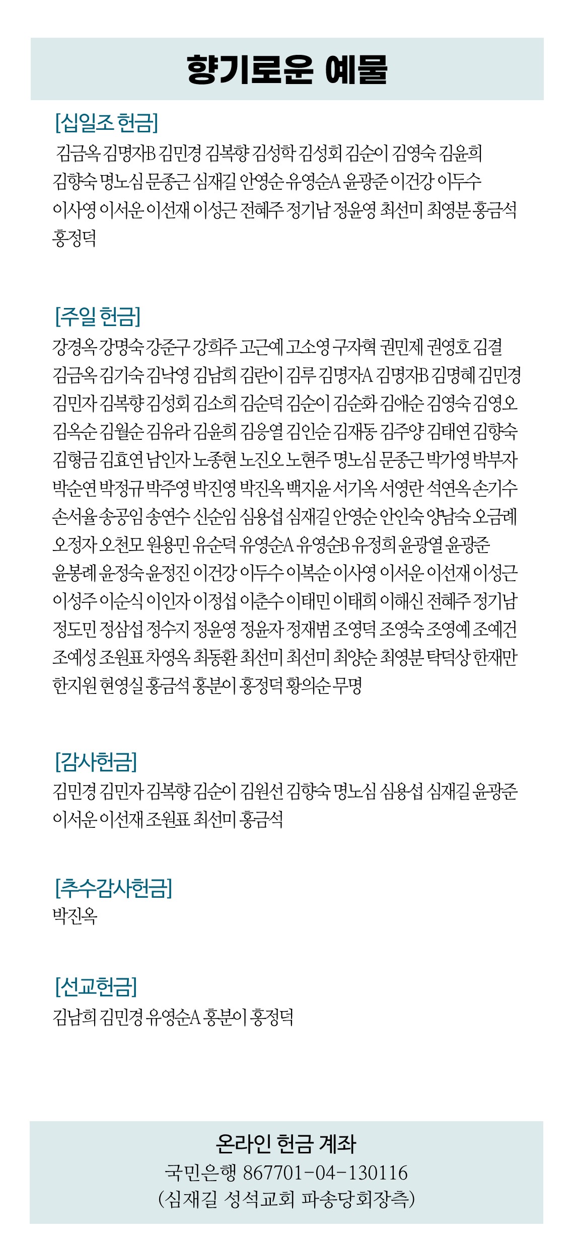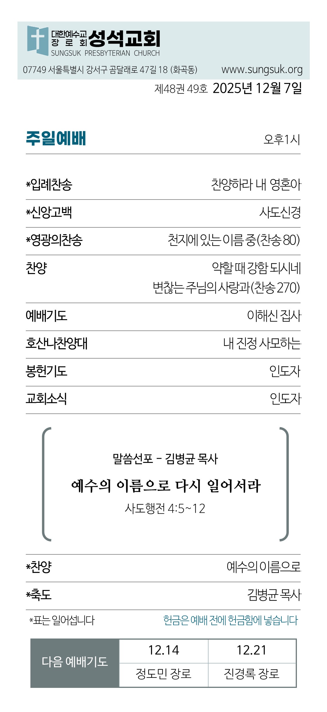 주일예배 주중집회 교회소식 향기로운예물 예배안내 섬기는이들 이름과 이메일을 등록하시면 주보가 발행될 때 미리 이메일로 보내드립니다. 이름 이메일 구독 신청 SUNGSUKCHURCH 07749 서울 강서구 곰달래로47길 18 성석교회