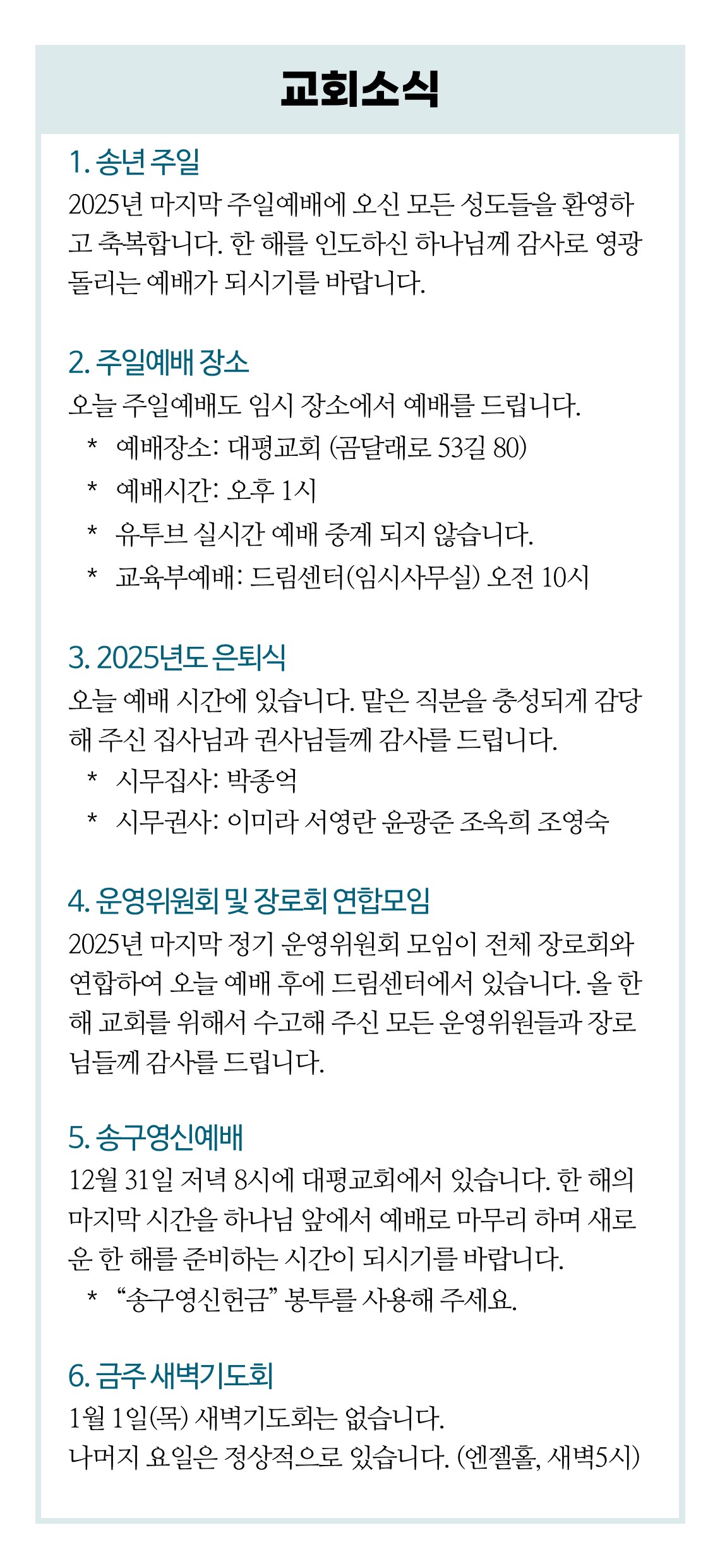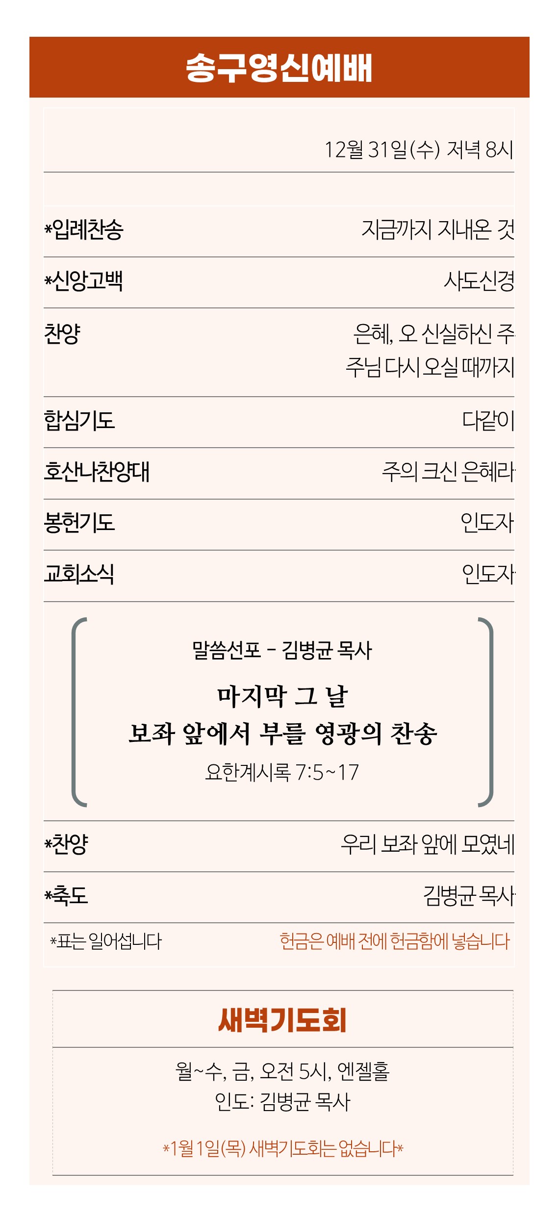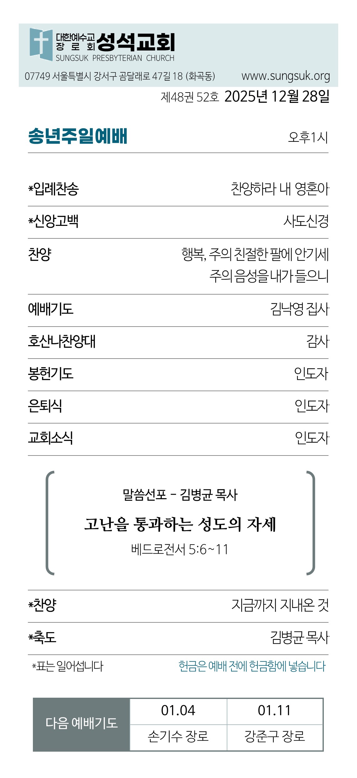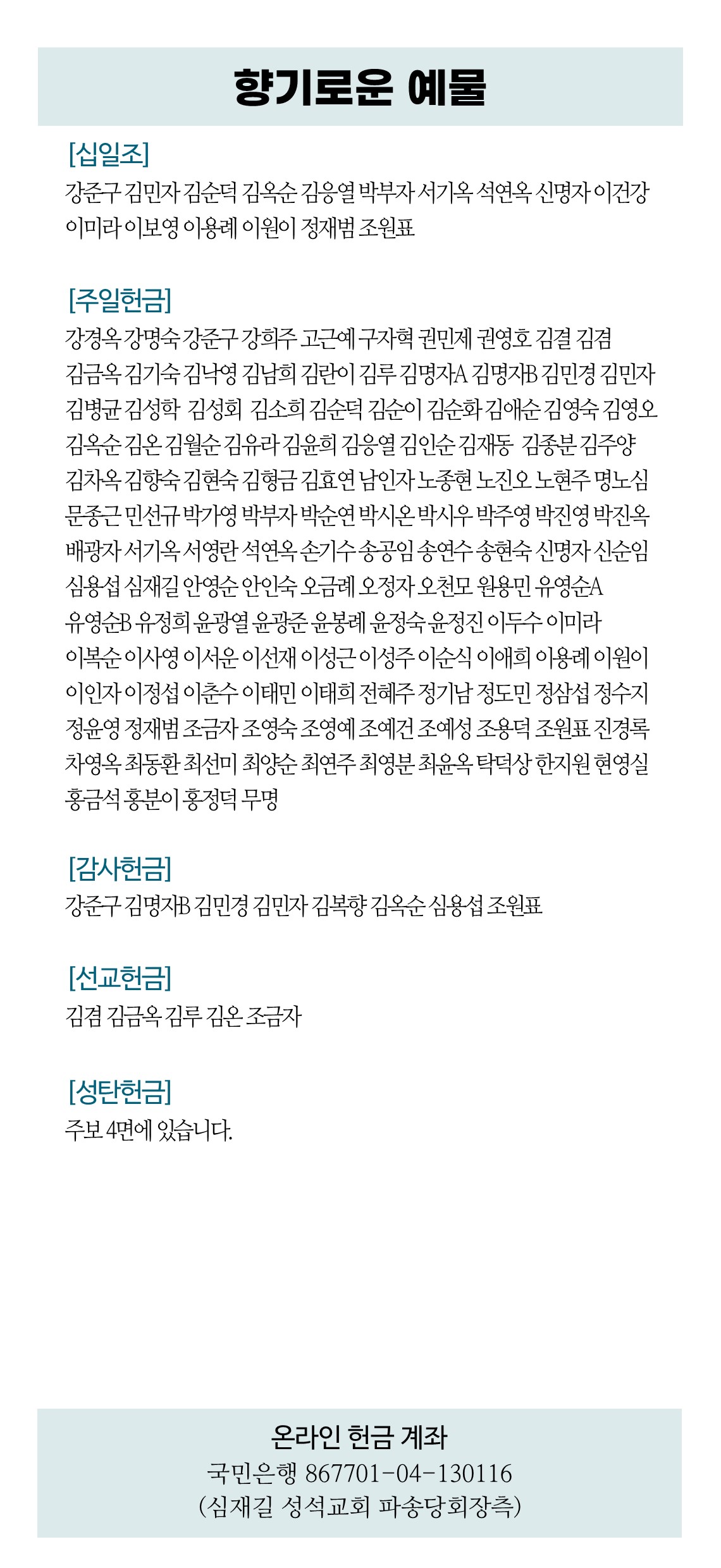 주일예배 송구영신예배 교회소식 향기로운예물 예배안내 섬기는이들 이름과 이메일을 등록하시면 주보가 발행될 때 미리 이메일로 보내드립니다. 이름 이메일 구독 신청 SUNGSUKCHURCH 07749 서울 강서구 곰달래로47길 18 성석교회