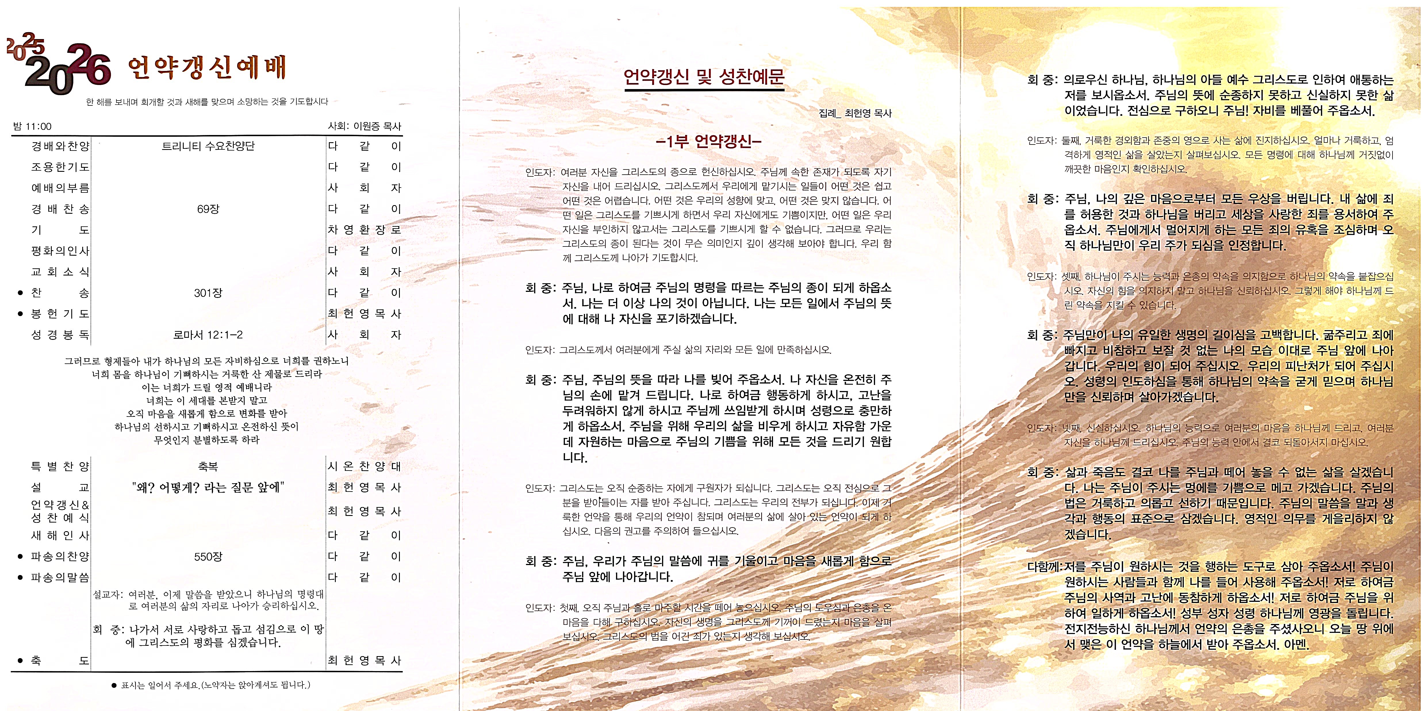 송구영신예배 이름과 이메일을 등록하시면 주보가 발행될 때 미리 이메일로 보내드립니다. 이름 이메일 구독 신청 담임목사 : 최헌영 033-742-2170 26427 강원특별자치도 원주시 일산로 40 제일감리교회 https://wjmc.or.kr/